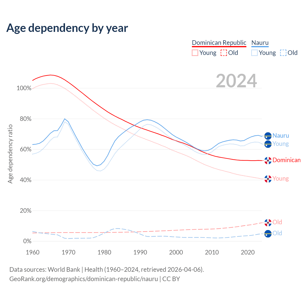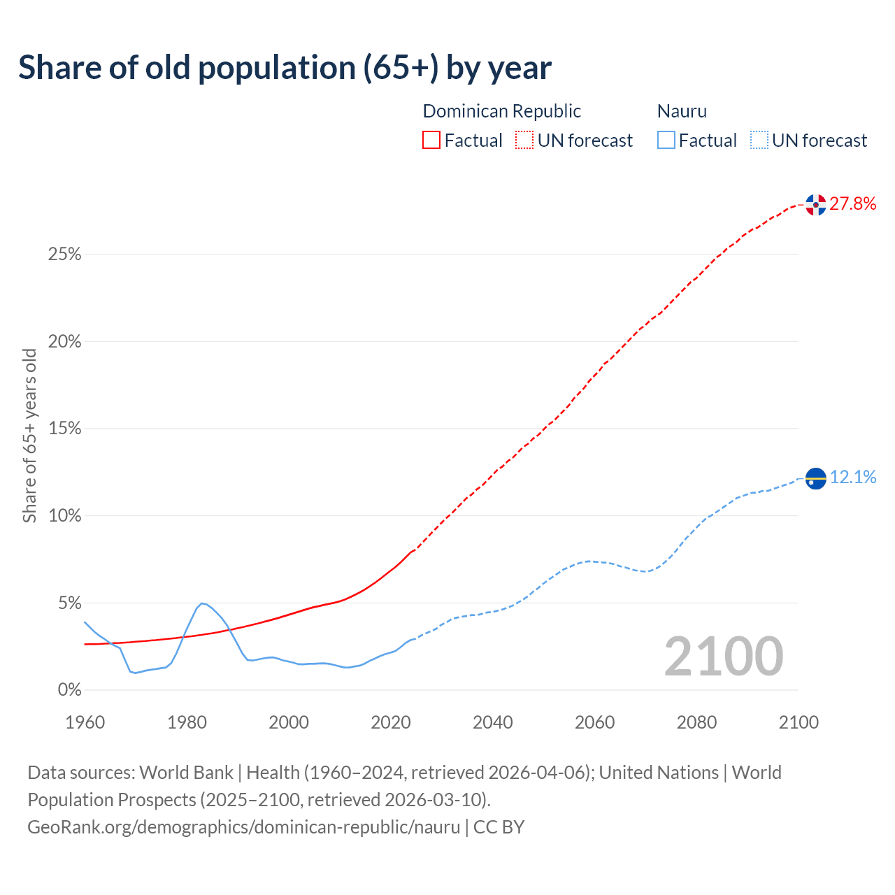 - The share of old-age demographic (65+) in the Dominican Republic is 7.88% vs 2.85% in Nauru.