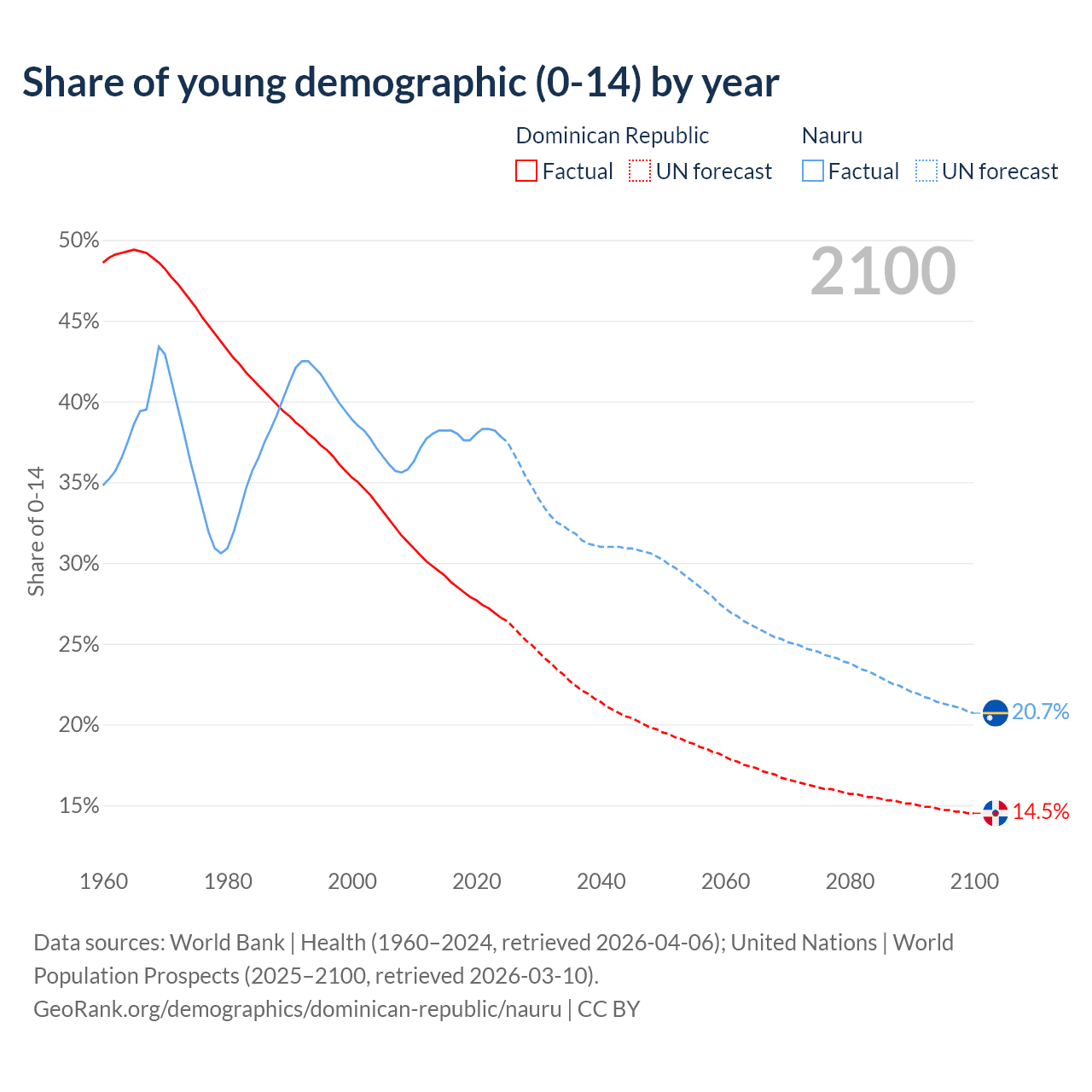 - The share of young demographic (0-15 years old) in the Dominican Republic is 26.6% vs 37.8% in Nauru.