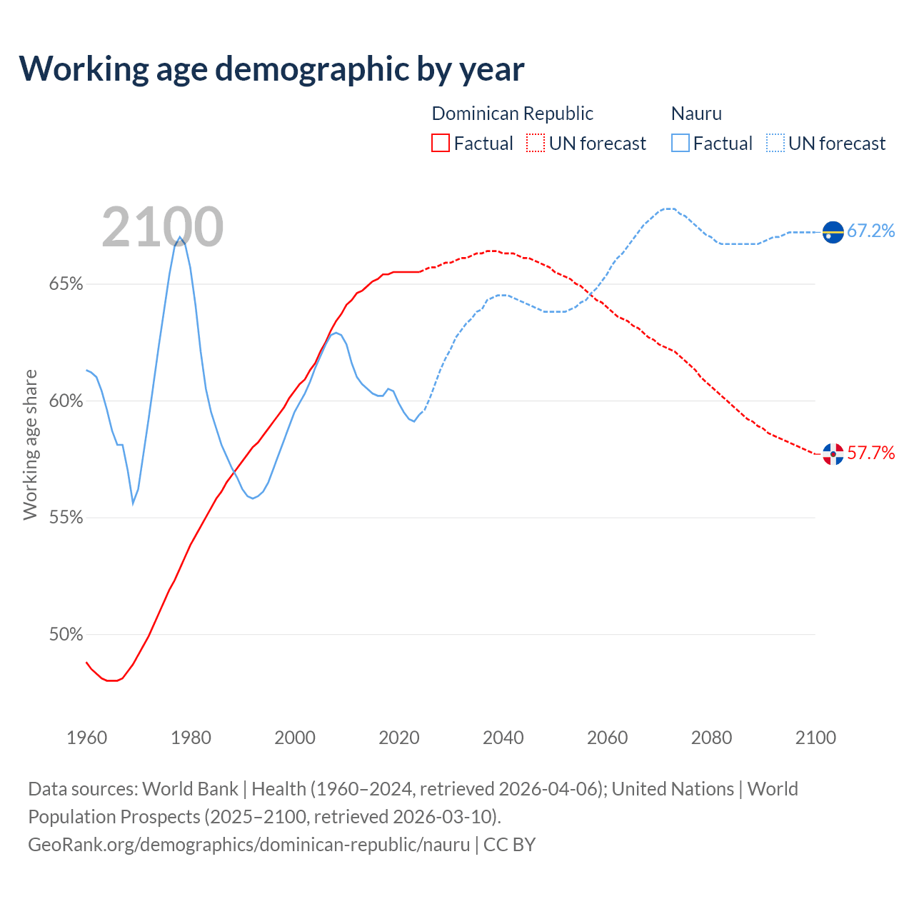 - The Dominican Republic has 7.63M working age adults (aged 15-64) vs 7.2K in Nauru.
