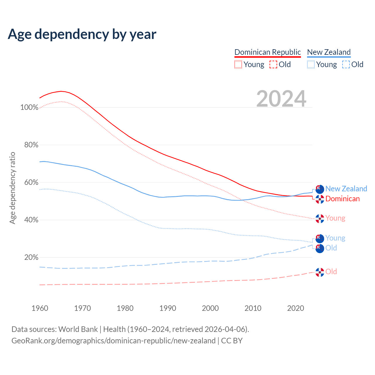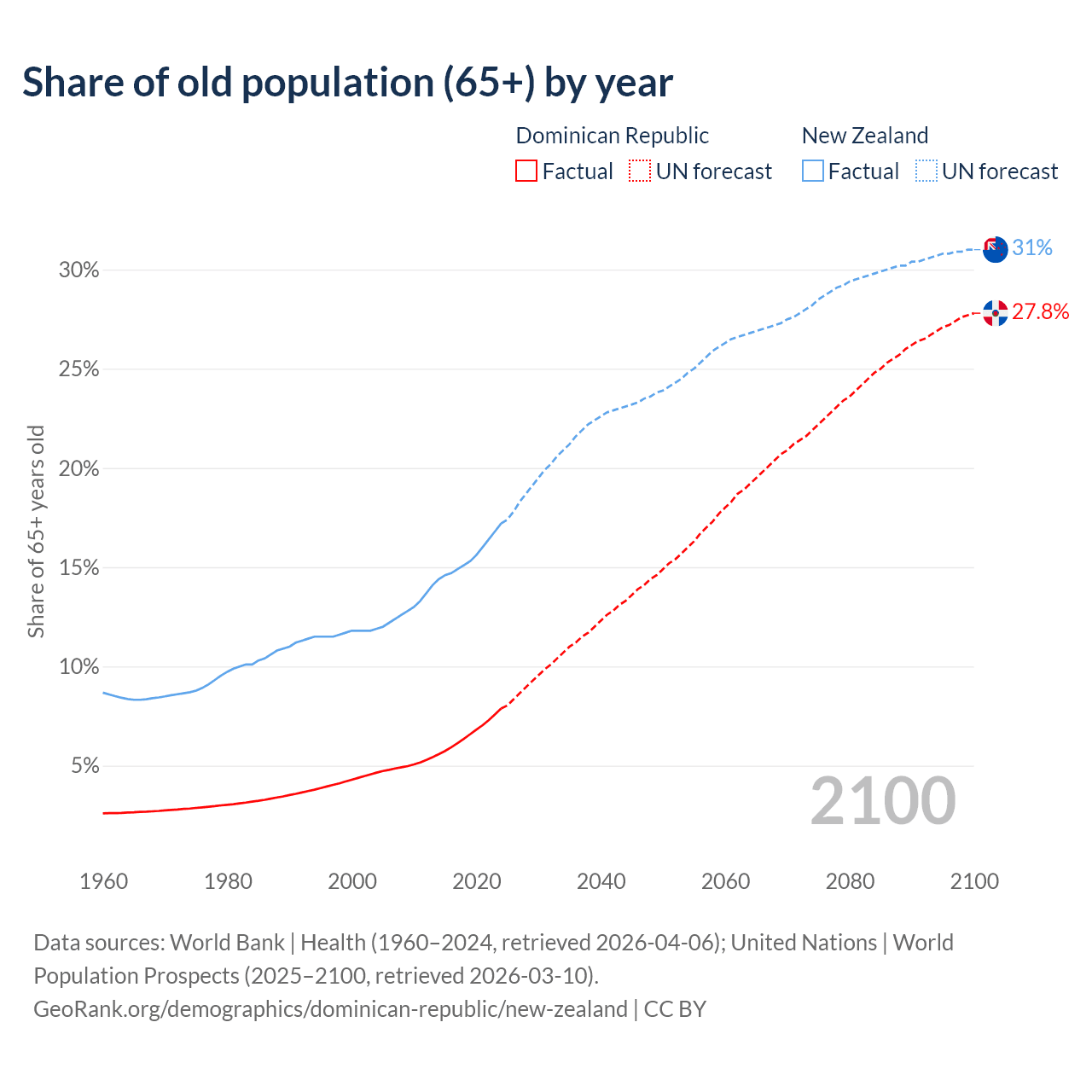 - The share of old-age demographic (65+) in the Dominican Republic is 7.88% vs 17.2% in New Zealand.