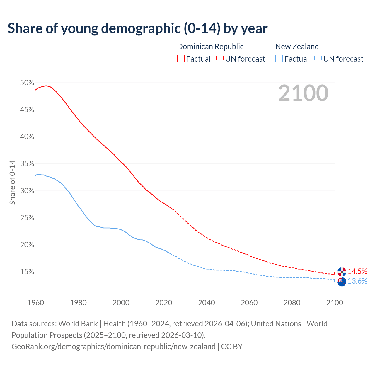 - The share of young demographic (0-15 years old) in the Dominican Republic is 26.6% vs 18.1% in New Zealand.