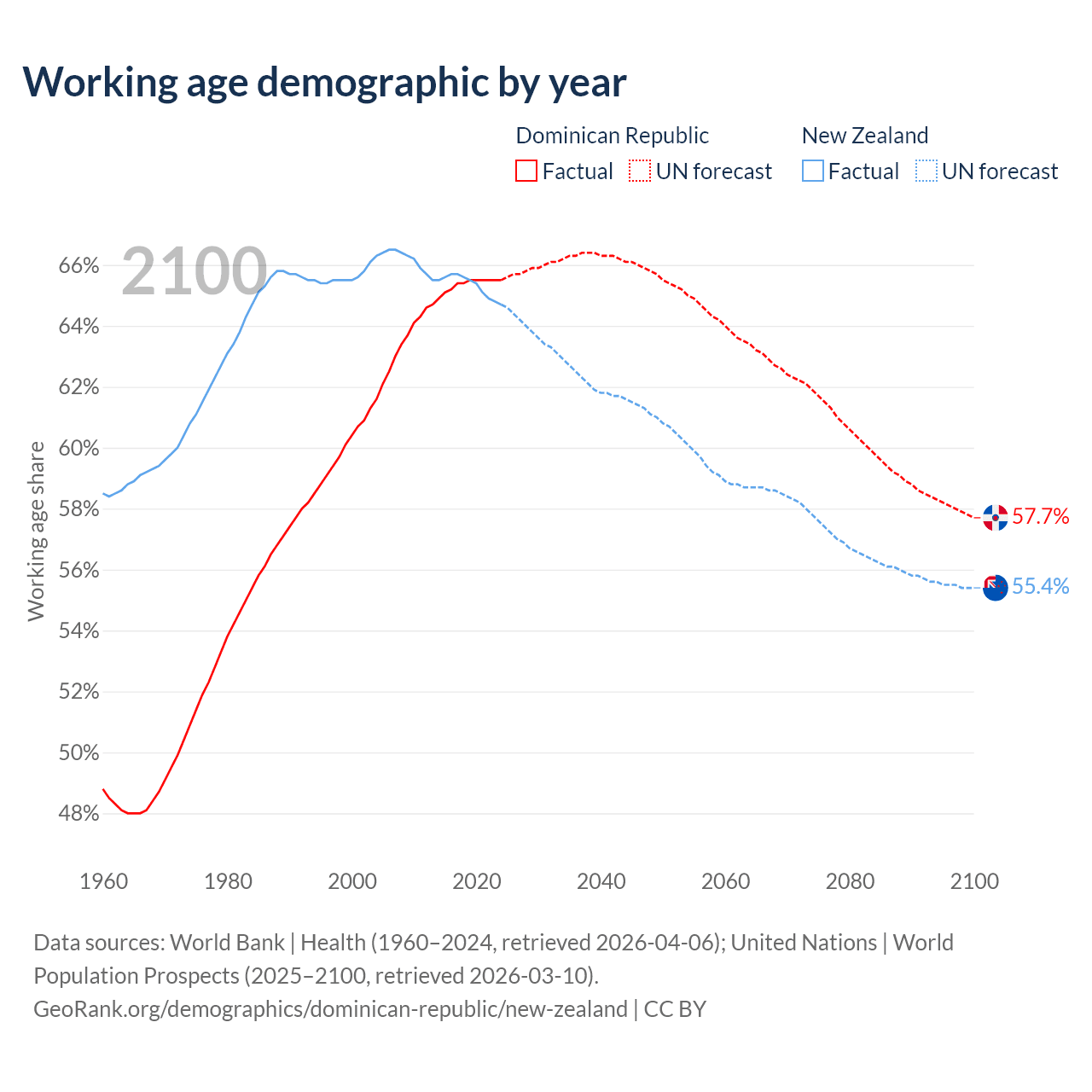 - The Dominican Republic has 7.63M working age adults (aged 15-64) vs 3.48M in New Zealand.