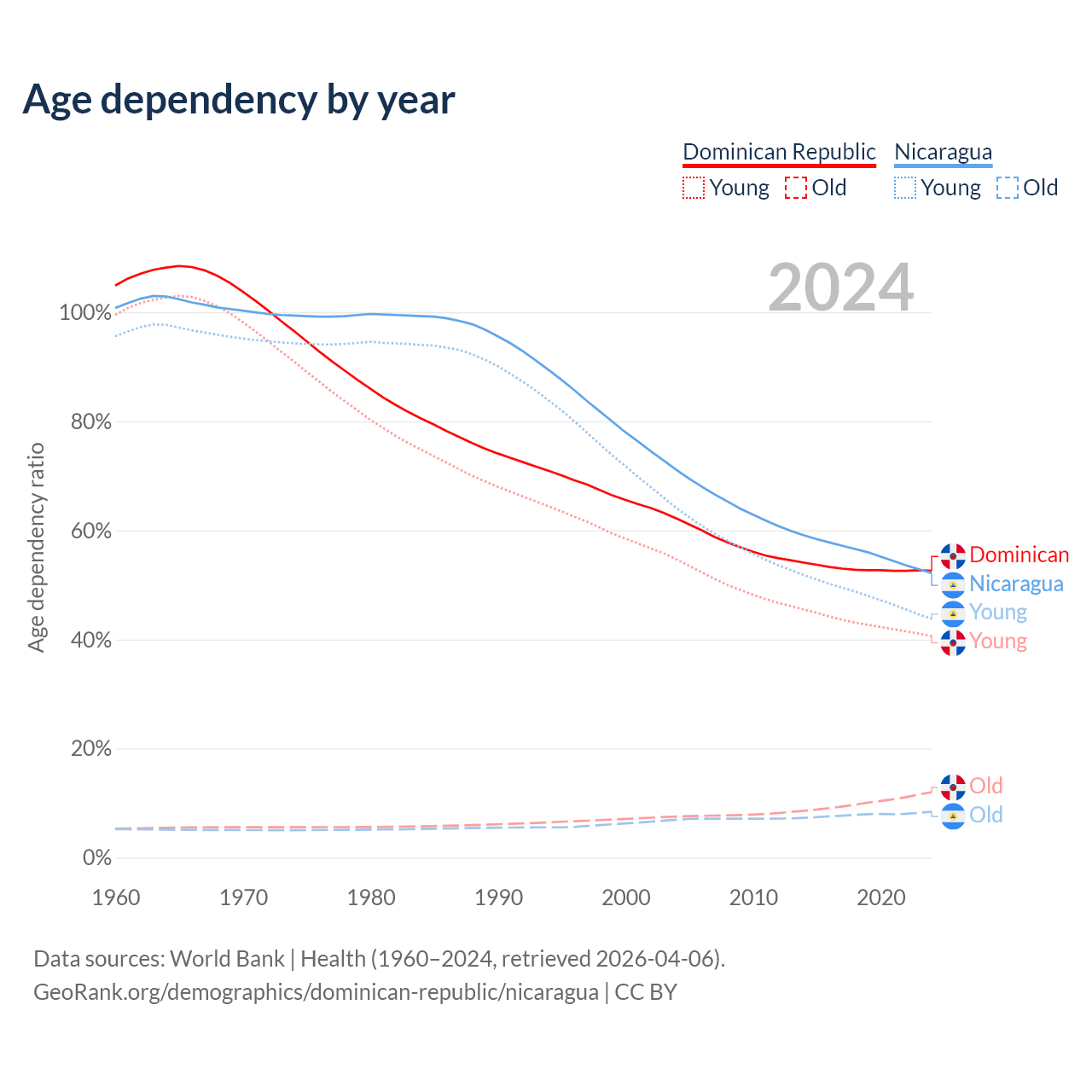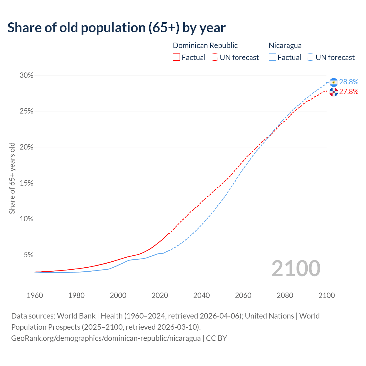 The share of older people aged 65 and over is 7.88% in the Dominican Republic and 5.53% in Nicaragua. Life expectancy in the Dominican Republic compared to Nicaragua .