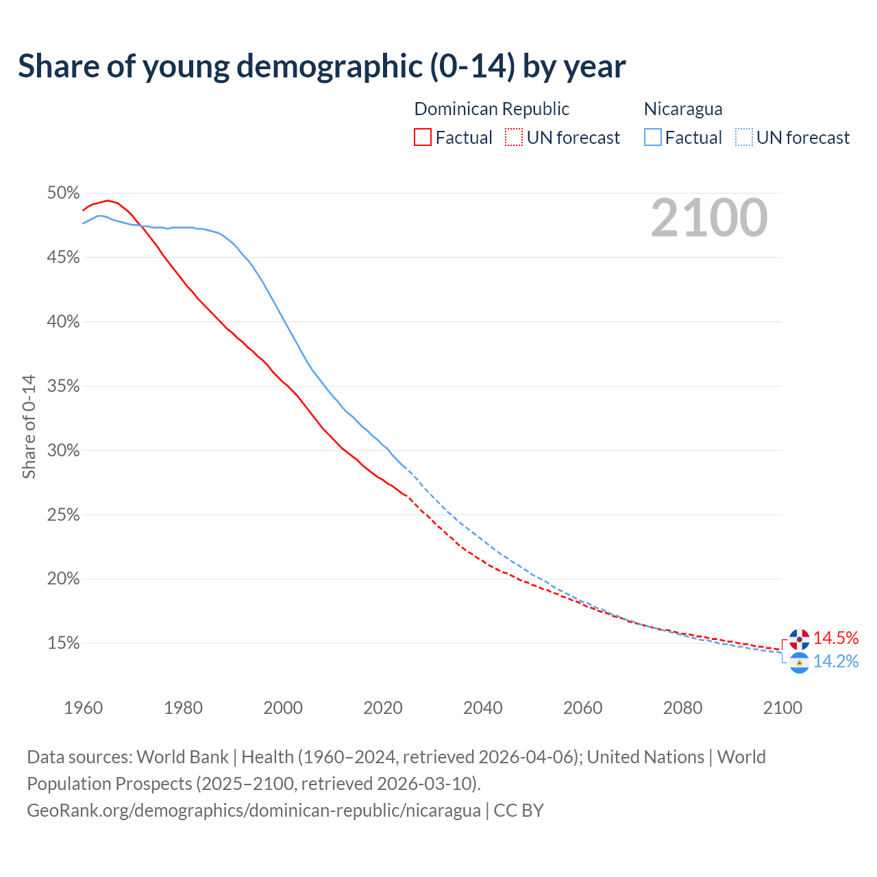 - The share of young demographic (0-15 years old) in the Dominican Republic is 26.6% vs 28.8% in Nicaragua.