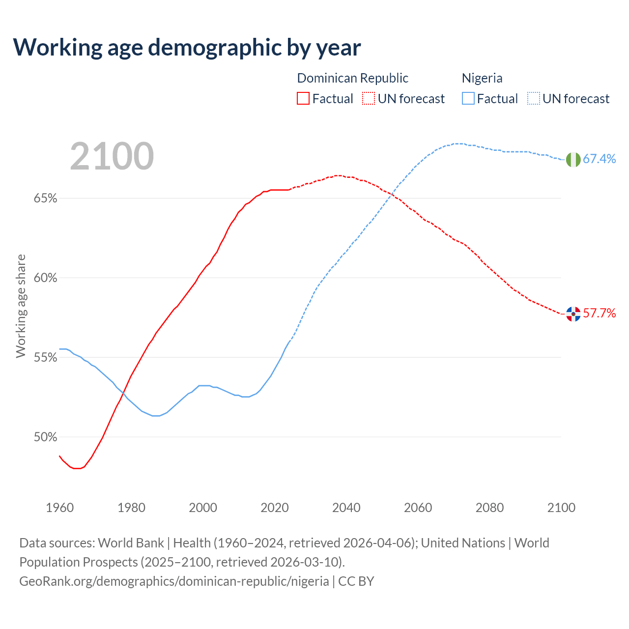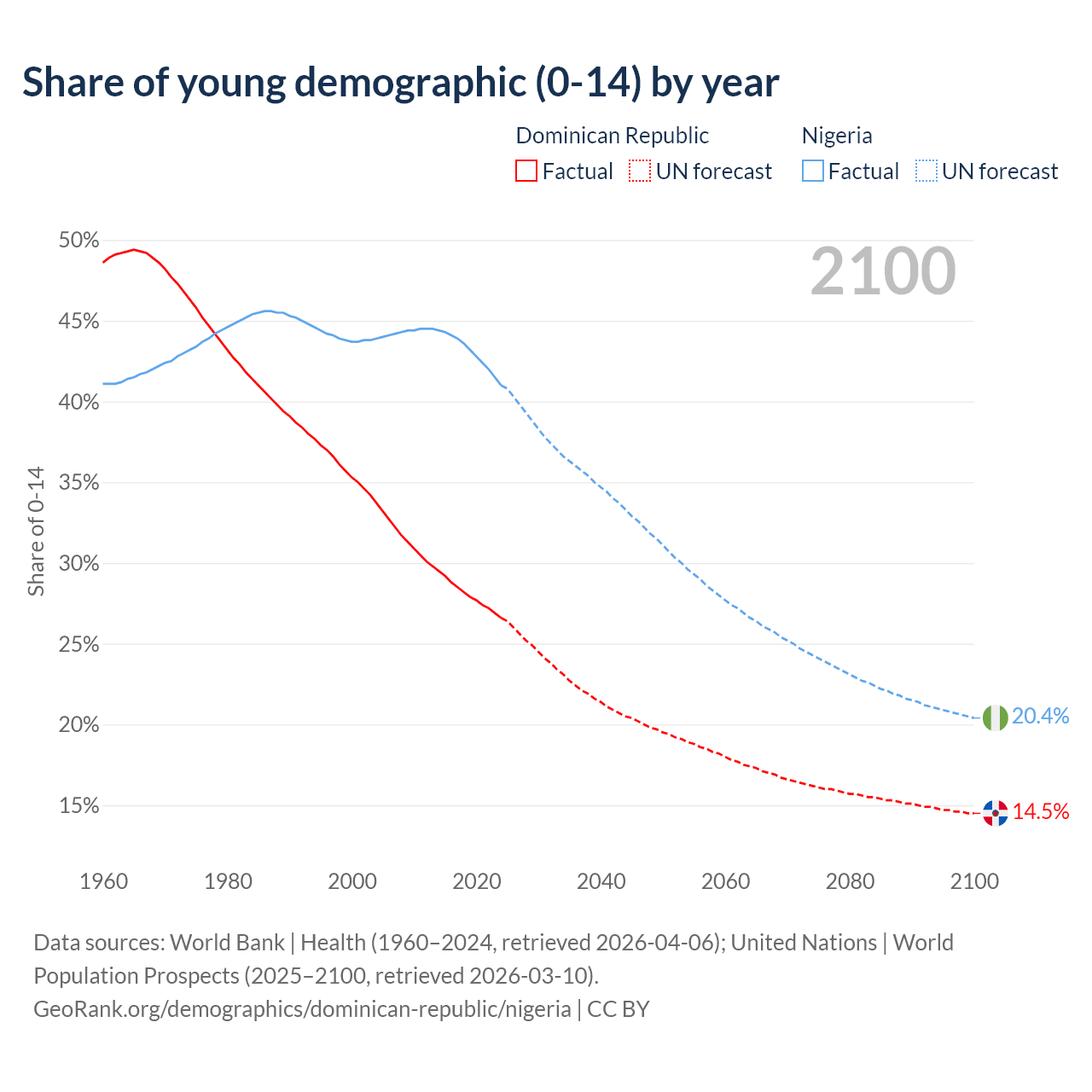 Median age Dominican Republic vs Nigeria, 1960-2100