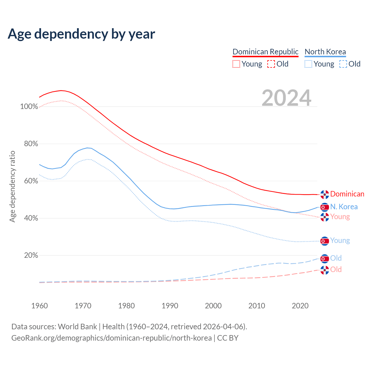 - The share of old-age demographic (65+) in the Dominican Republic is 7.88% vs 12.4% in North Korea.