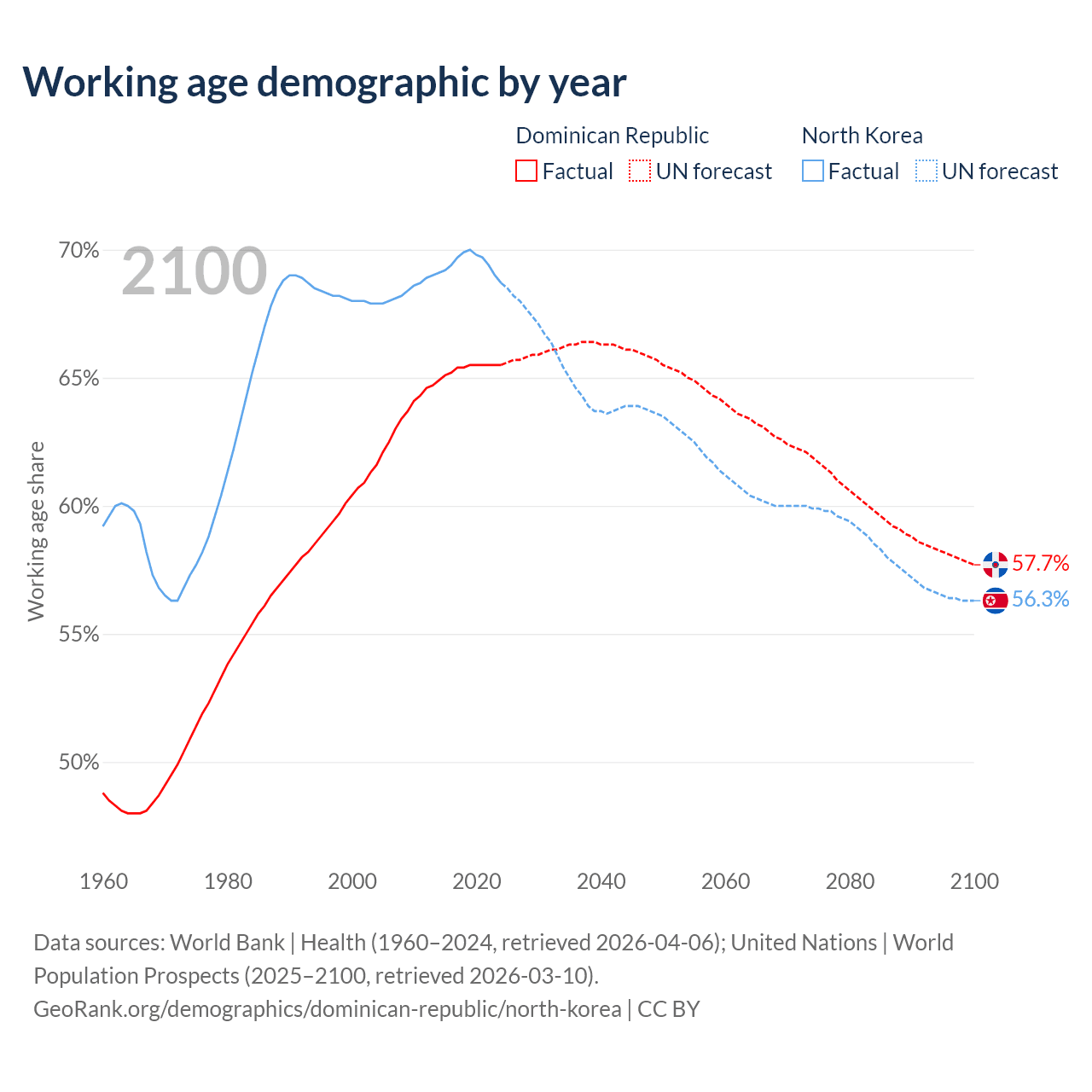 - The Dominican Republic has 7.63M working age adults (aged 15-64) vs 18.3M in North Korea.