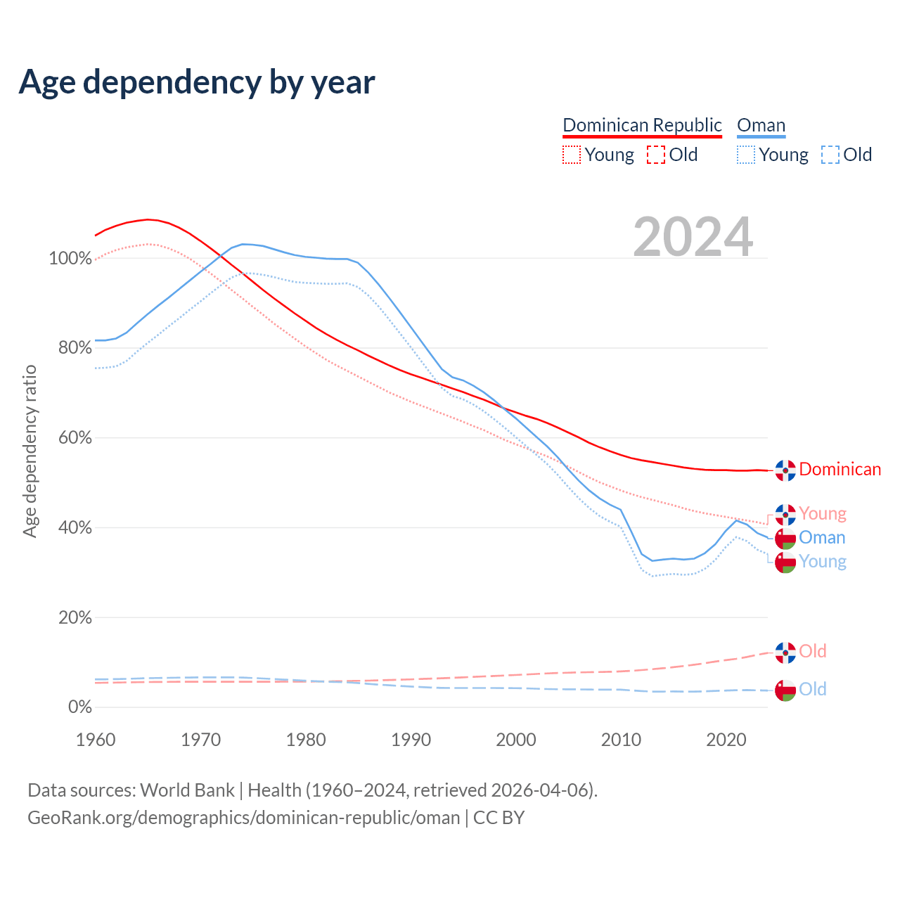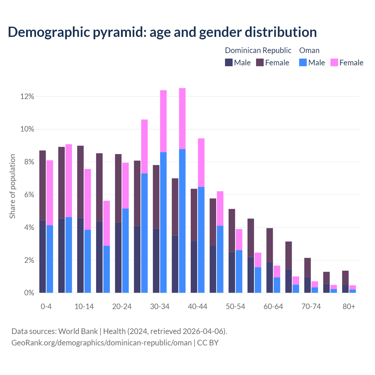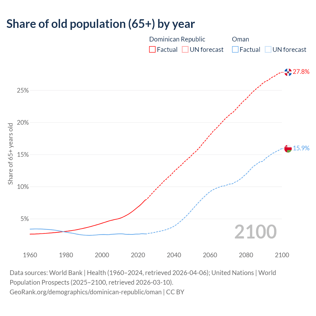- The share of old-age demographic (65+) in the Dominican Republic is 7.88% vs 2.64% in Oman.