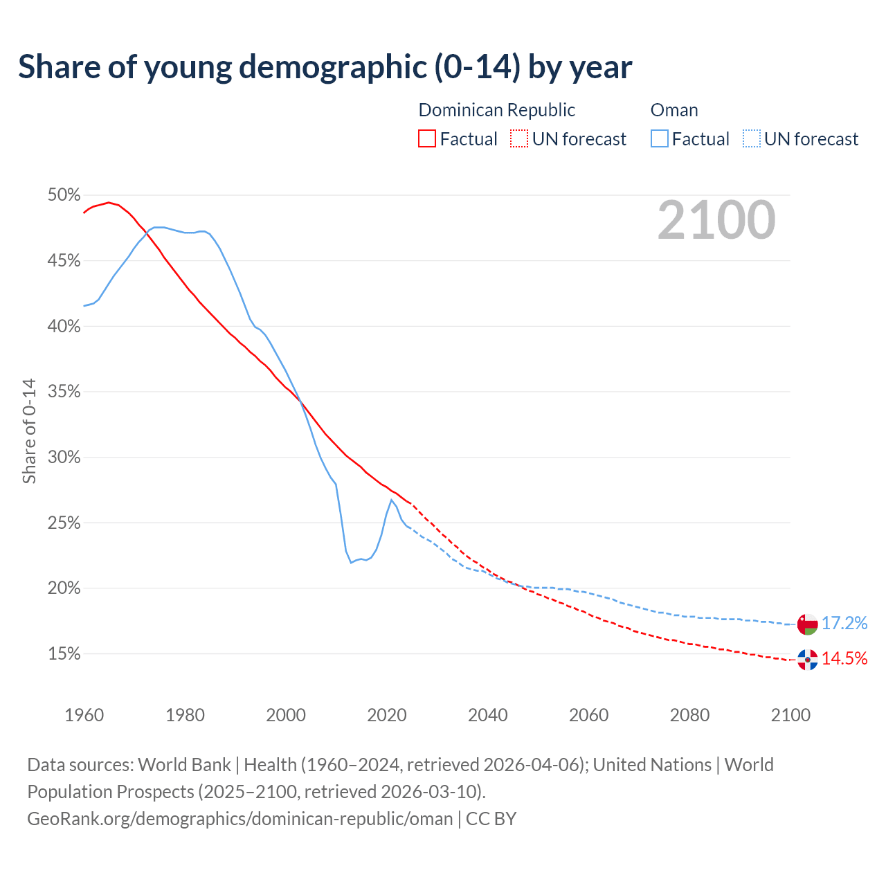 - The share of young demographic (0-15 years old) in the Dominican Republic is 26.6% vs 24.7% in Oman.