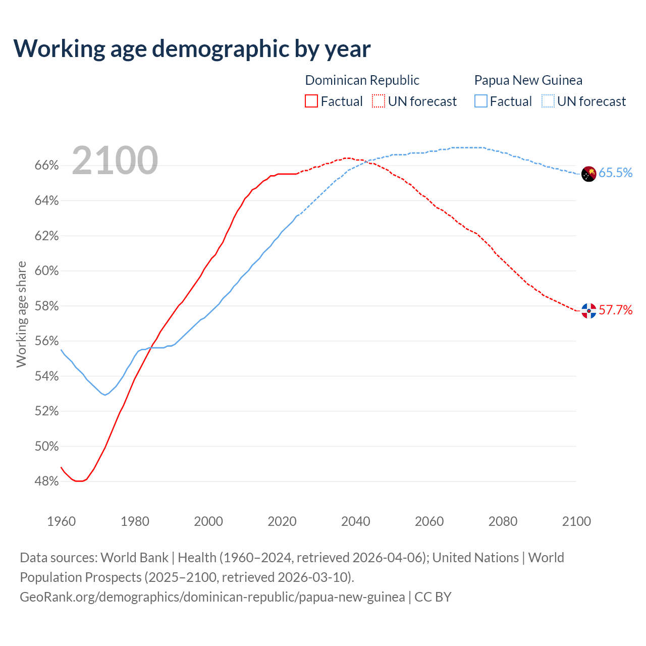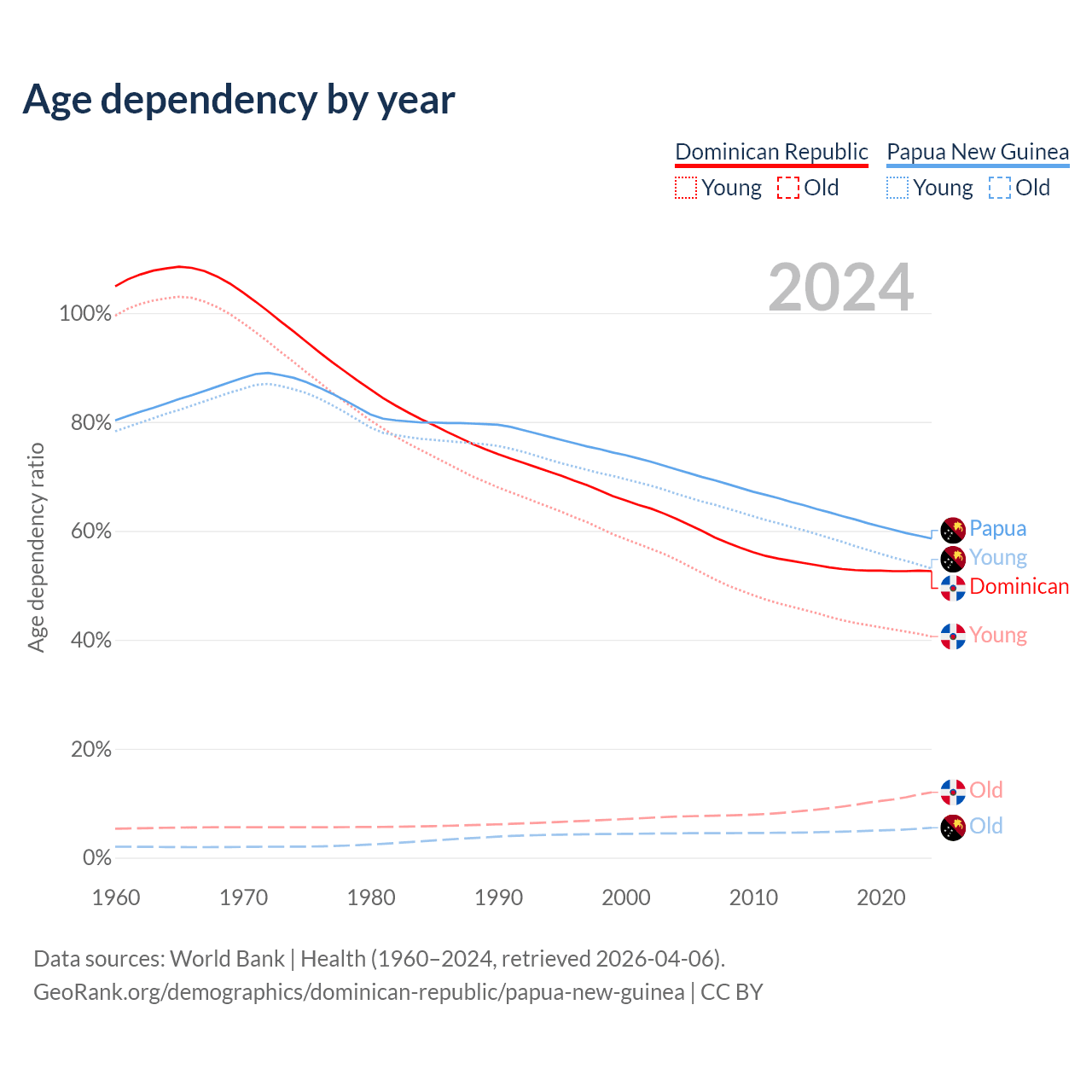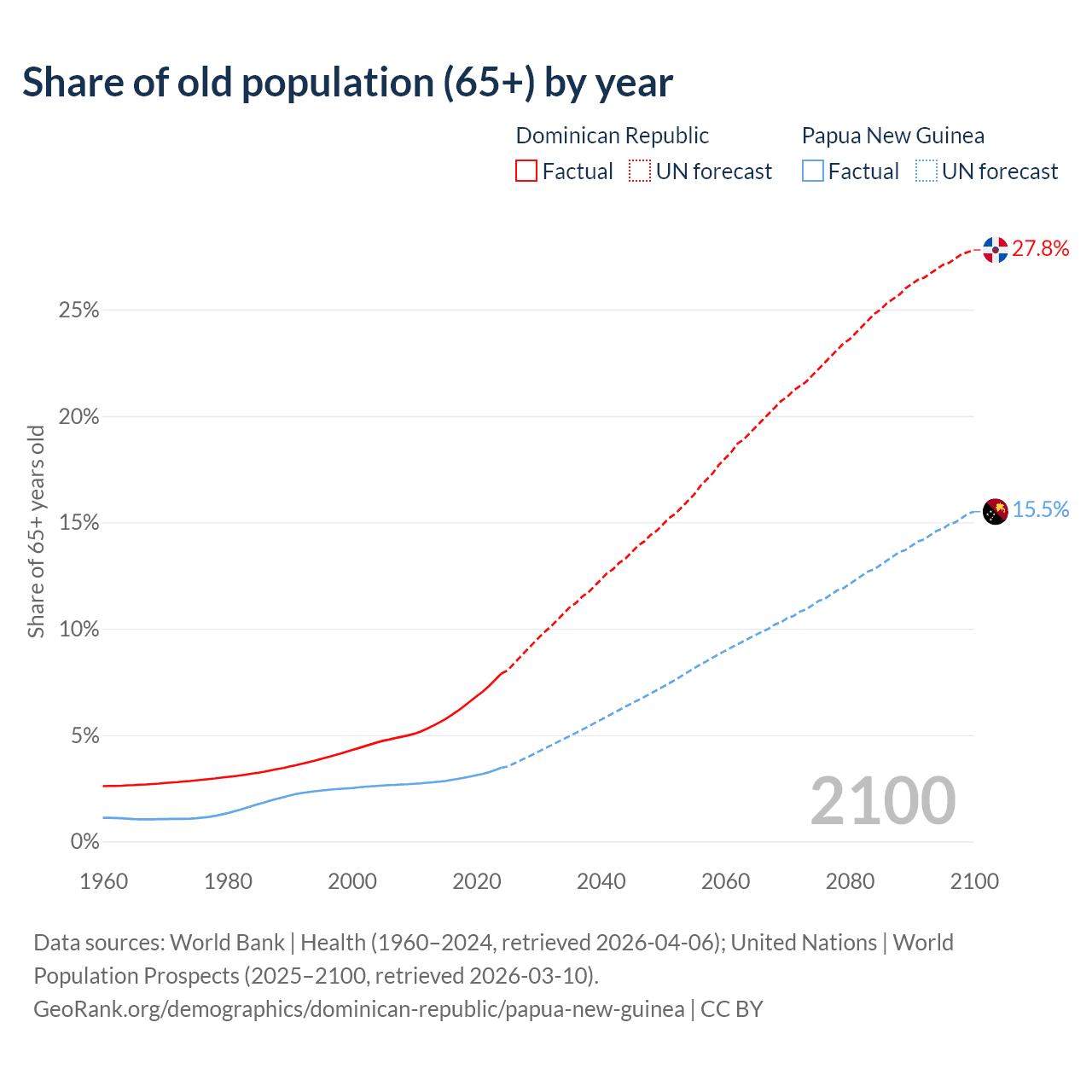 - The share of old-age demographic (65+) in the Dominican Republic is 7.88% vs 3.46% in Papua New Guinea.