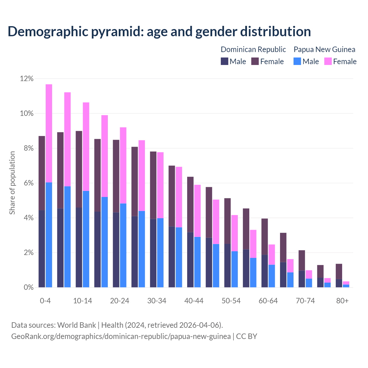 - As of 2026, the population of the Dominican Republic is 11.6M vs 11M in Papua New Guinea.