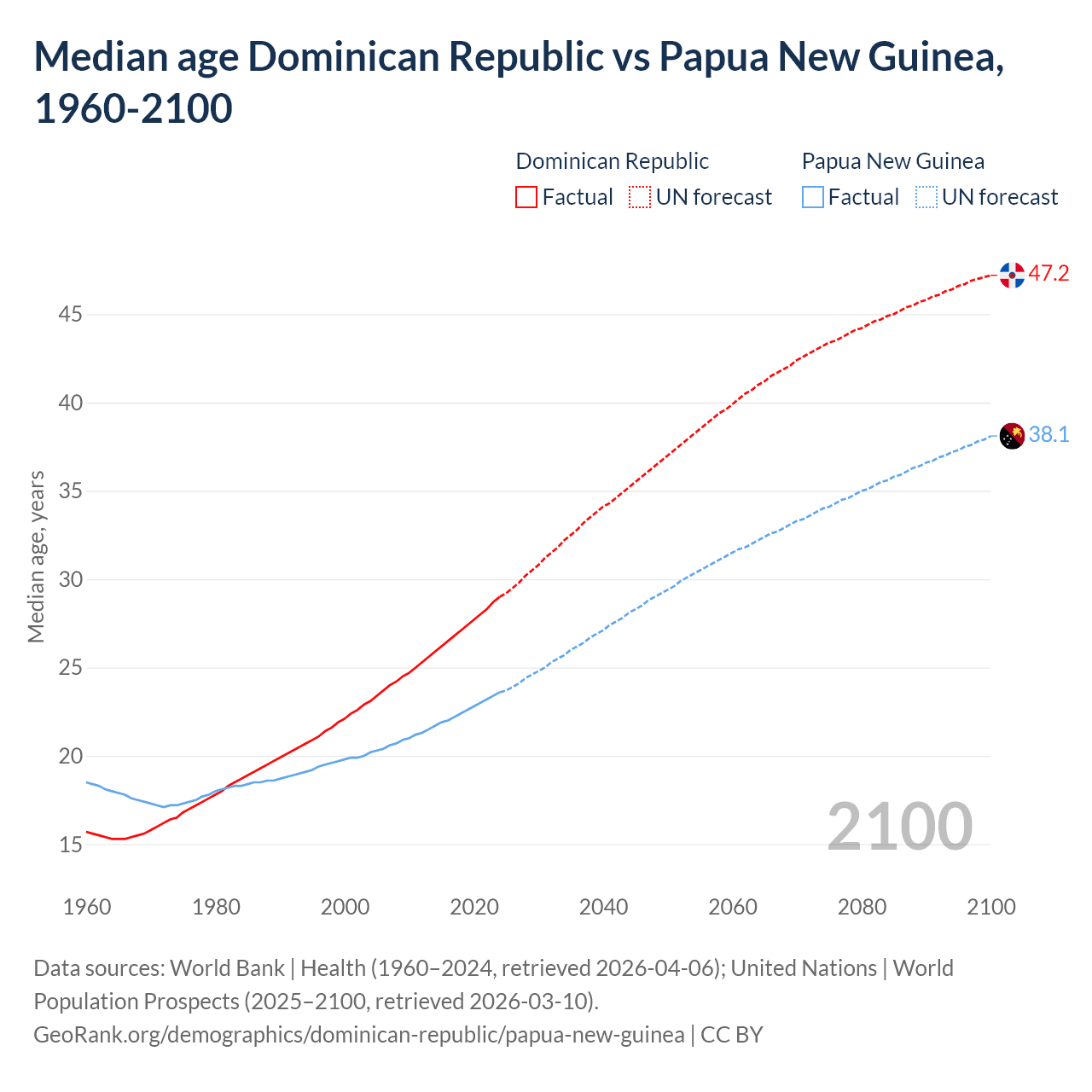 - The Dominican Republic is ranked 112/196 by median age (oldest to youngest) vs 140/196 for Papua New Guinea.