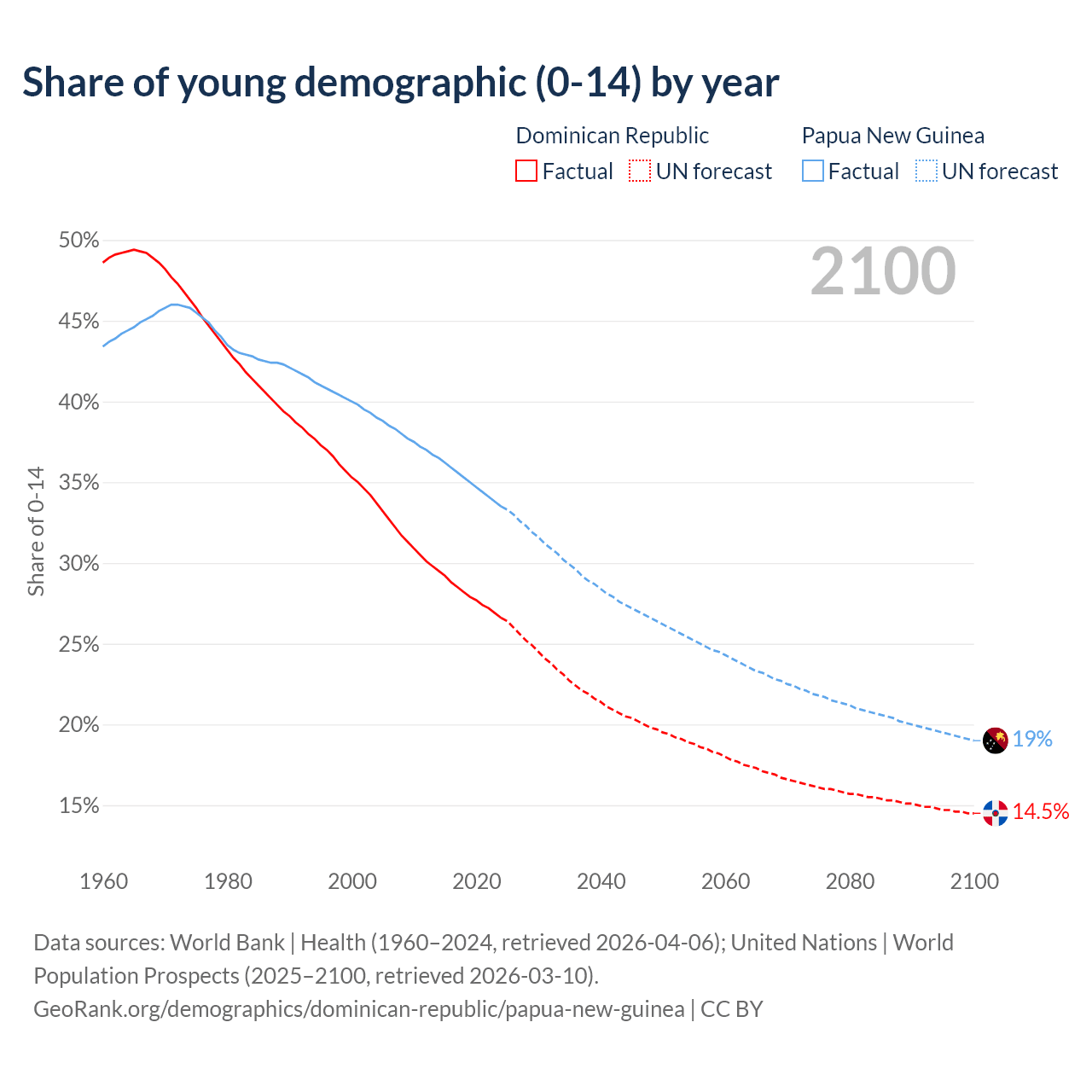- The share of young demographic (0-15 years old) in the Dominican Republic is 26.6% vs 33.5% in Papua New Guinea.