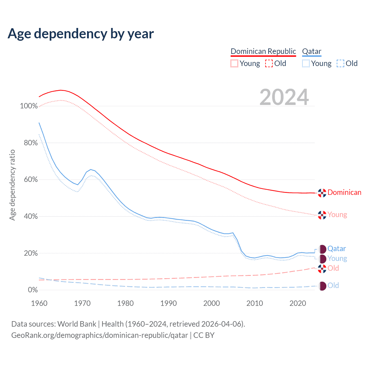 - The share of old-age demographic (65+) in the Dominican Republic is 7.88% vs 1.68% in Qatar.
