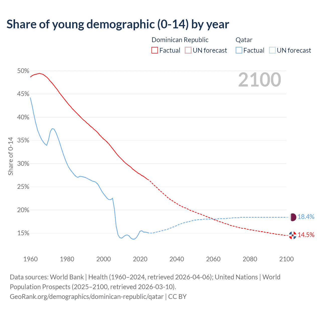 - The share of young demographic (0-15 years old) in the Dominican Republic is 26.6% vs 15.1% in Qatar.