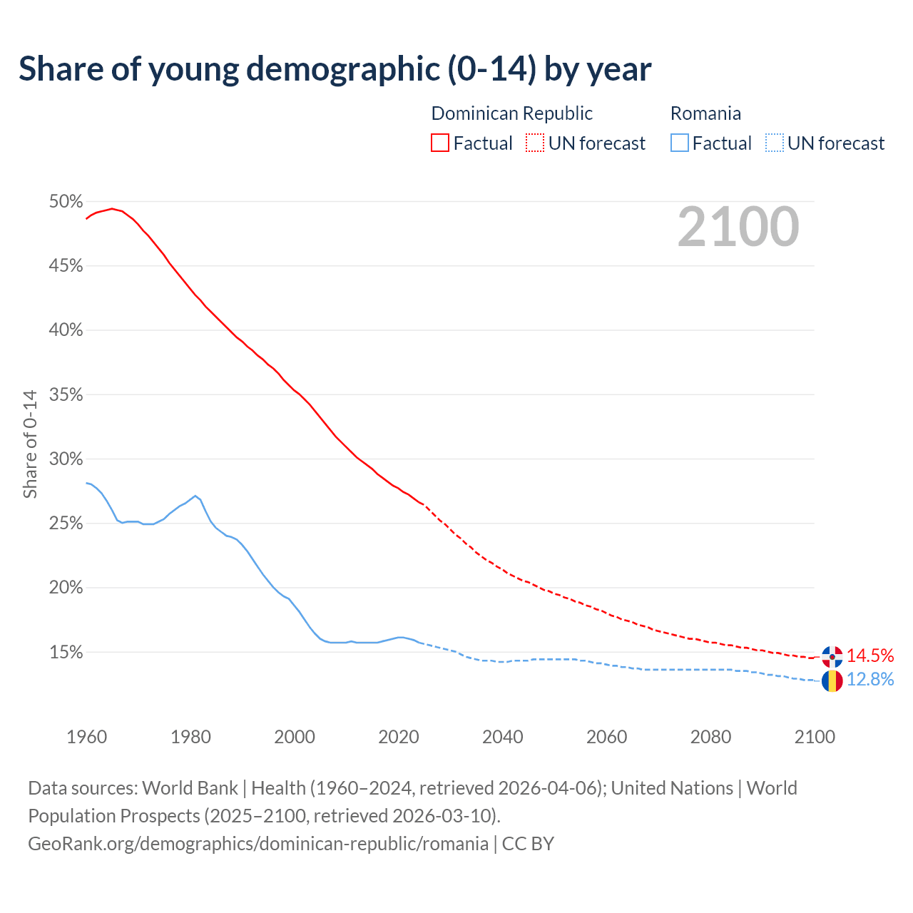 - The share of young demographic (0-15 years old) in the Dominican Republic is 26.6% vs 15.7% in Romania.