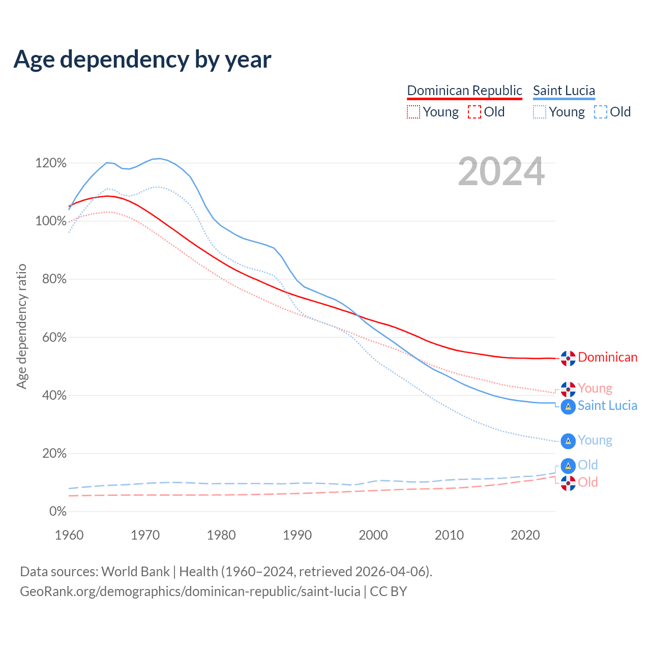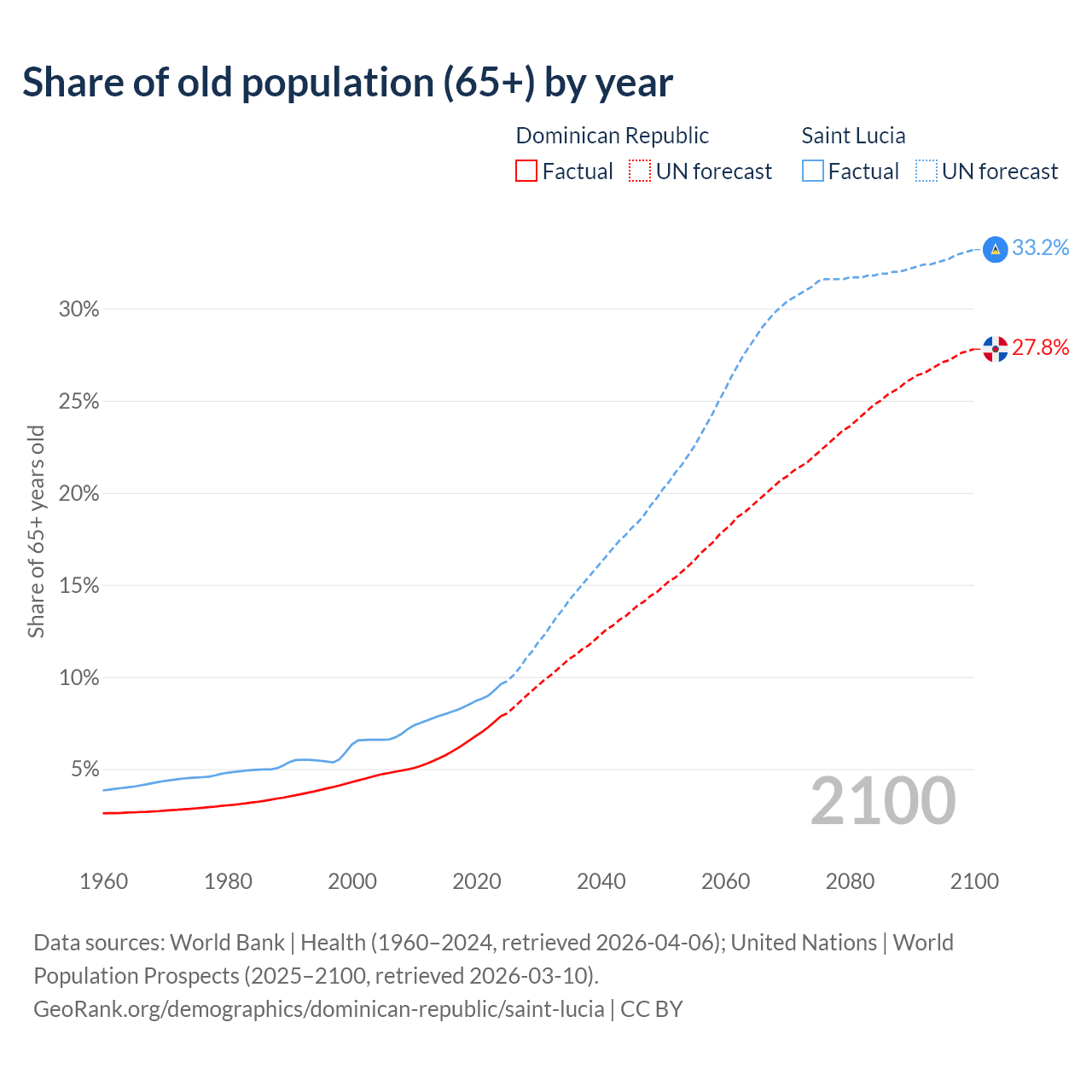 - The share of old-age demographic (65+) in the Dominican Republic is 7.88% vs 9.62% in Saint Lucia.