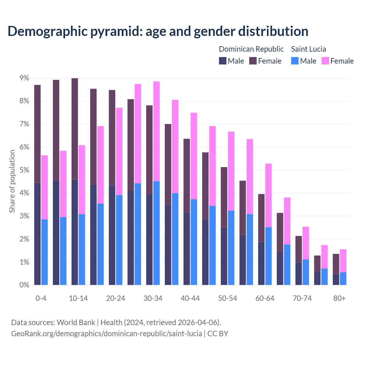 - The median age in the Dominican Republic is 29 years compared to 35.2 years in Saint Lucia.