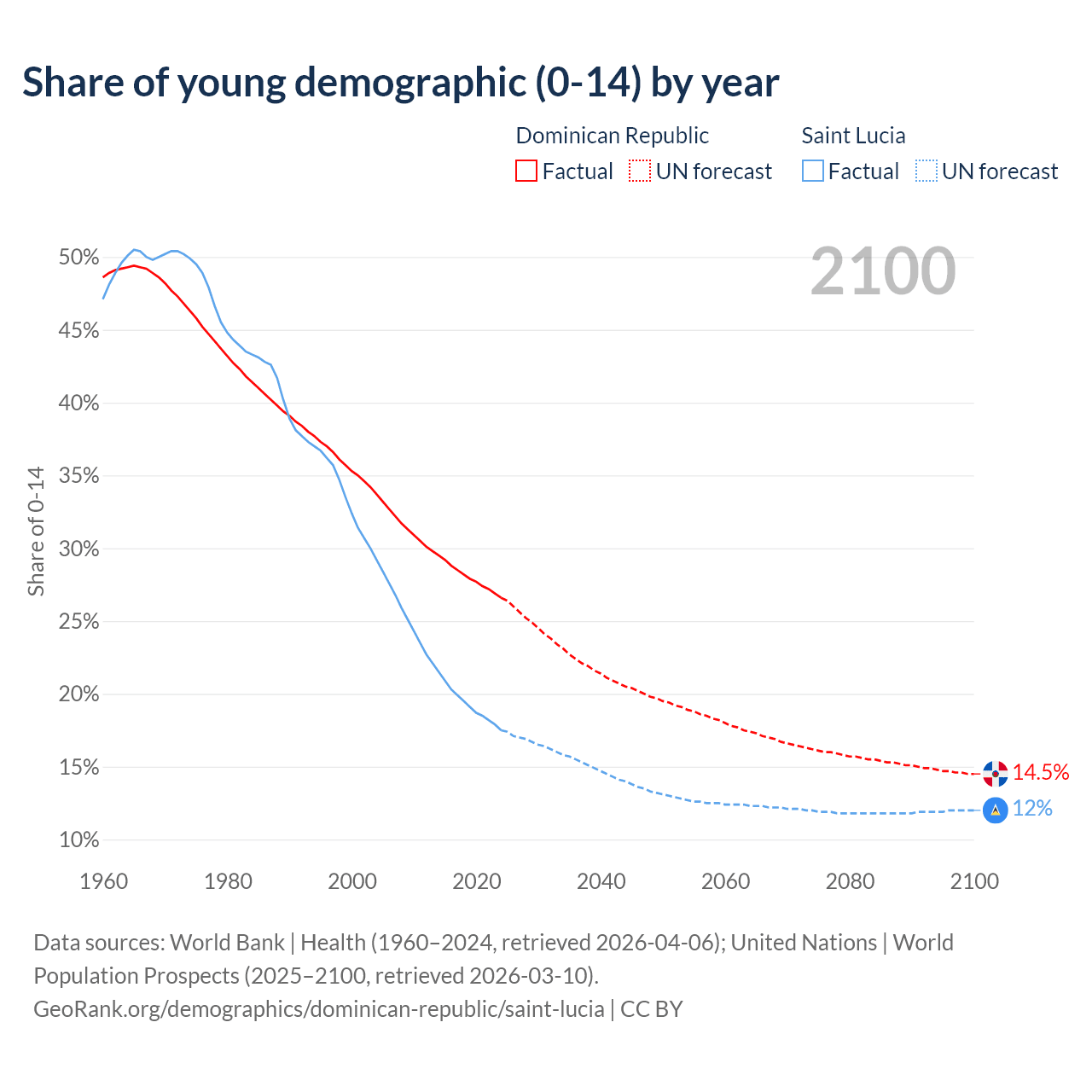 - The share of young demographic (0-15 years old) in the Dominican Republic is 26.6% vs 17.5% in Saint Lucia.