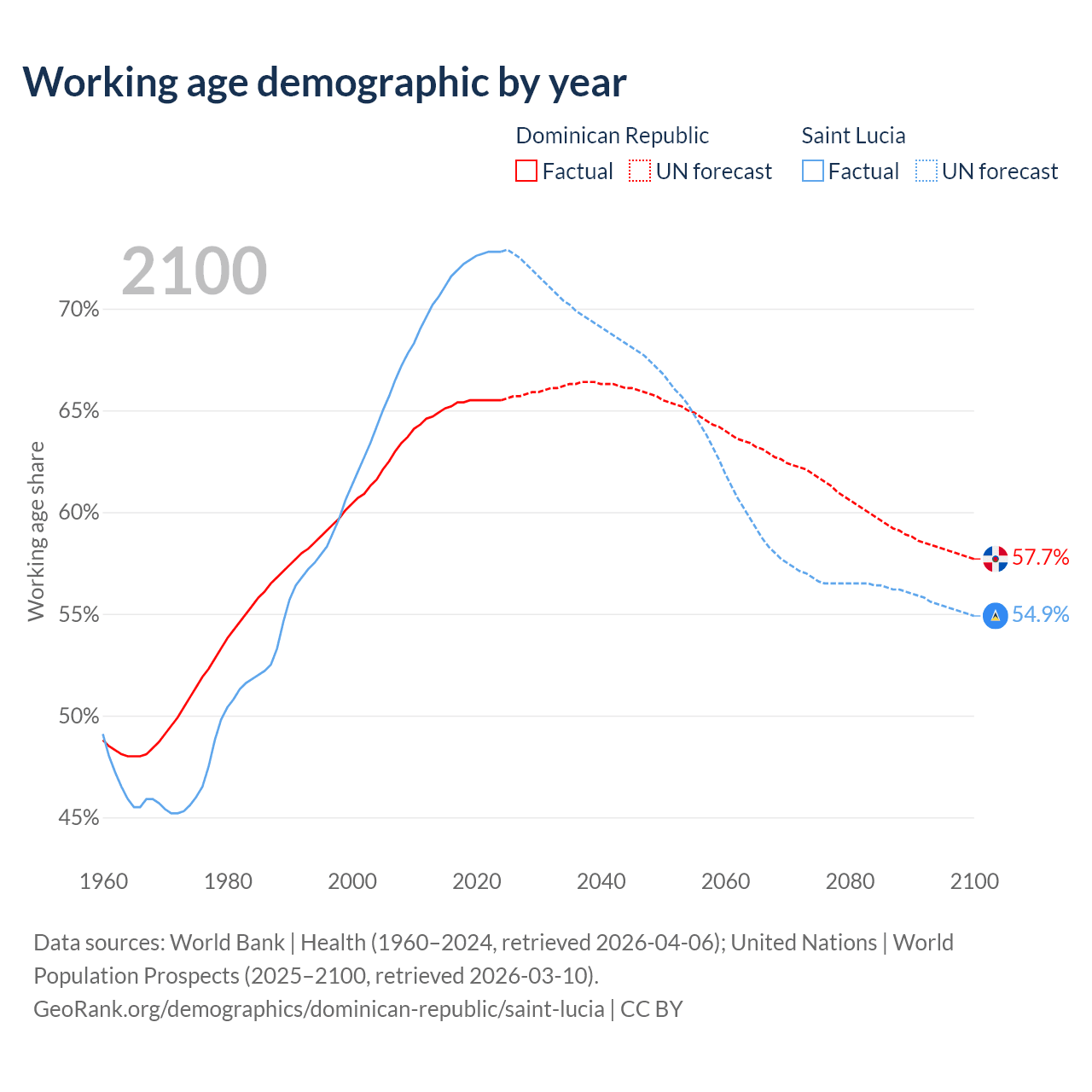 - The Dominican Republic has 7.63M working age adults (aged 15-64) vs 132K in Saint Lucia.