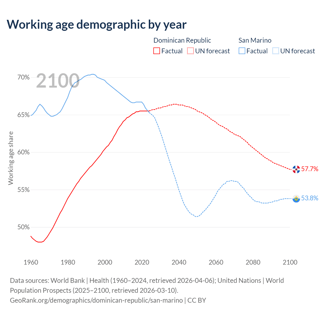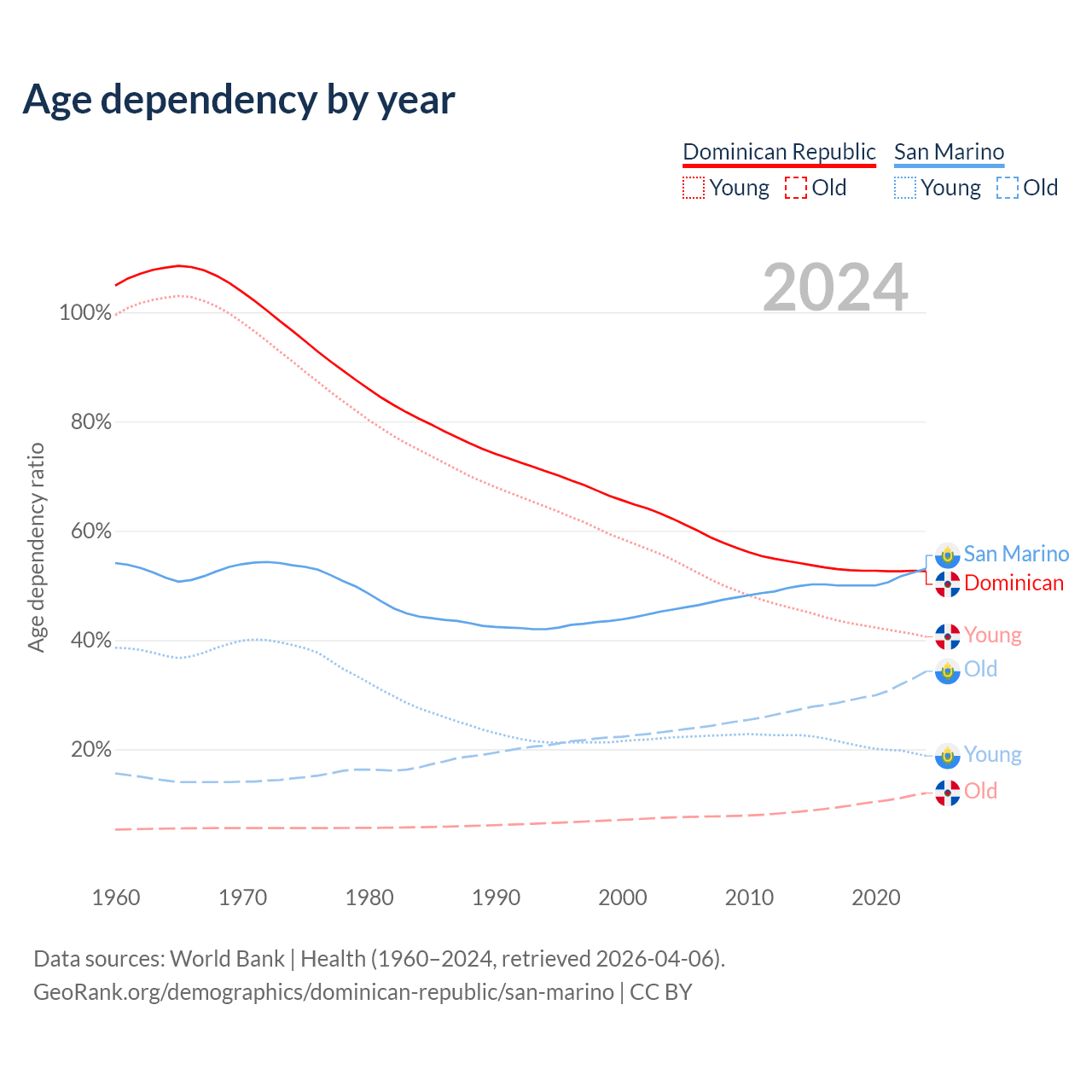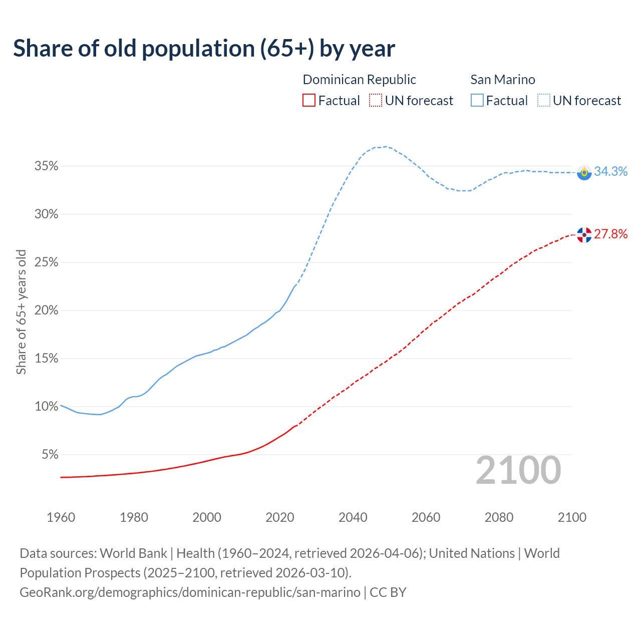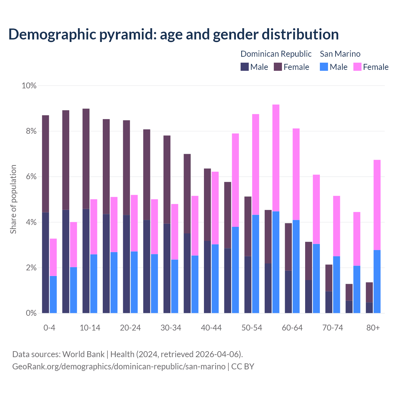 - The share of old-age demographic (65+) in the Dominican Republic is 7.88% vs 22.4% in San Marino.