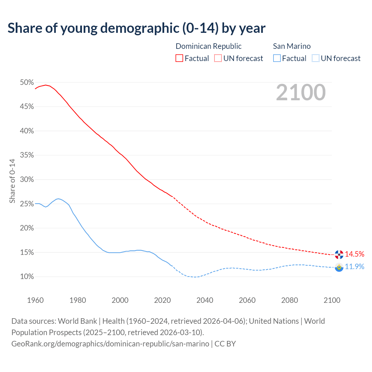 - The share of young demographic (0-15 years old) in the Dominican Republic is 26.6% vs 12.3% in San Marino.