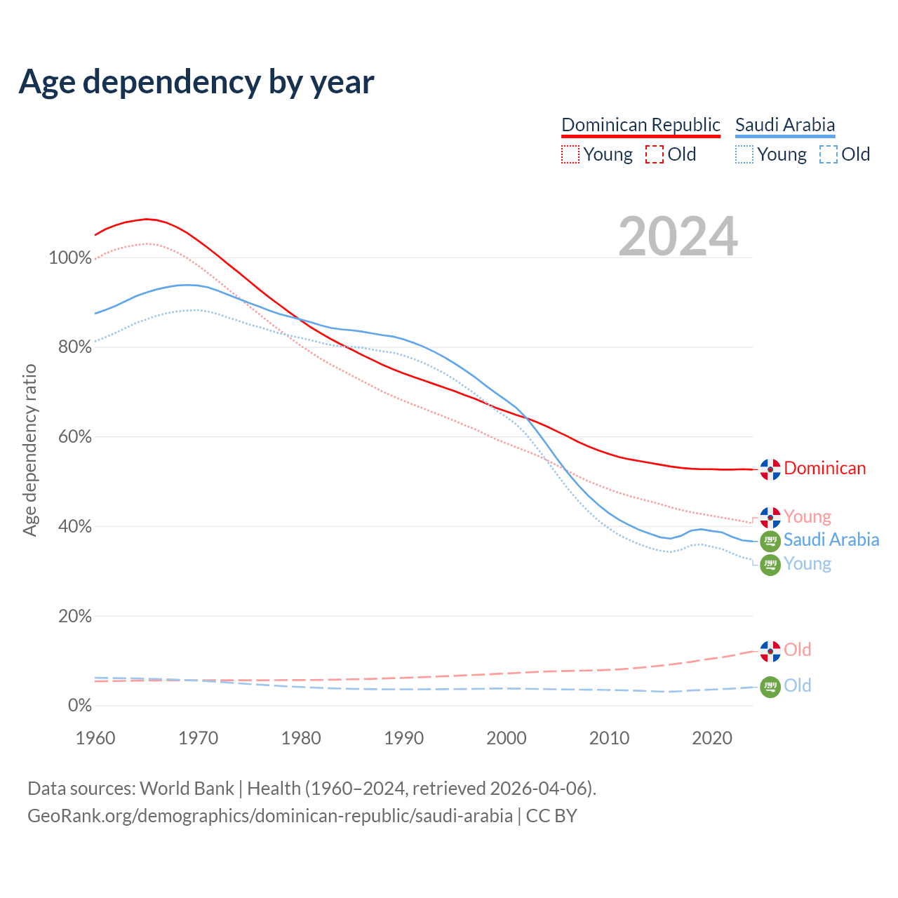 - The Dominican Republic is ranked 112/196 by median age (oldest to youngest) vs 98/196 for Saudi Arabia.