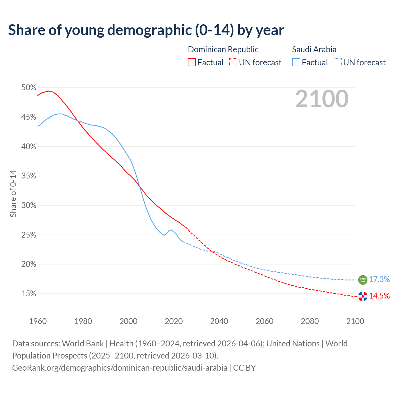 - The share of young demographic (0-15 years old) in the Dominican Republic is 26.6% vs 23.8% in Saudi Arabia.