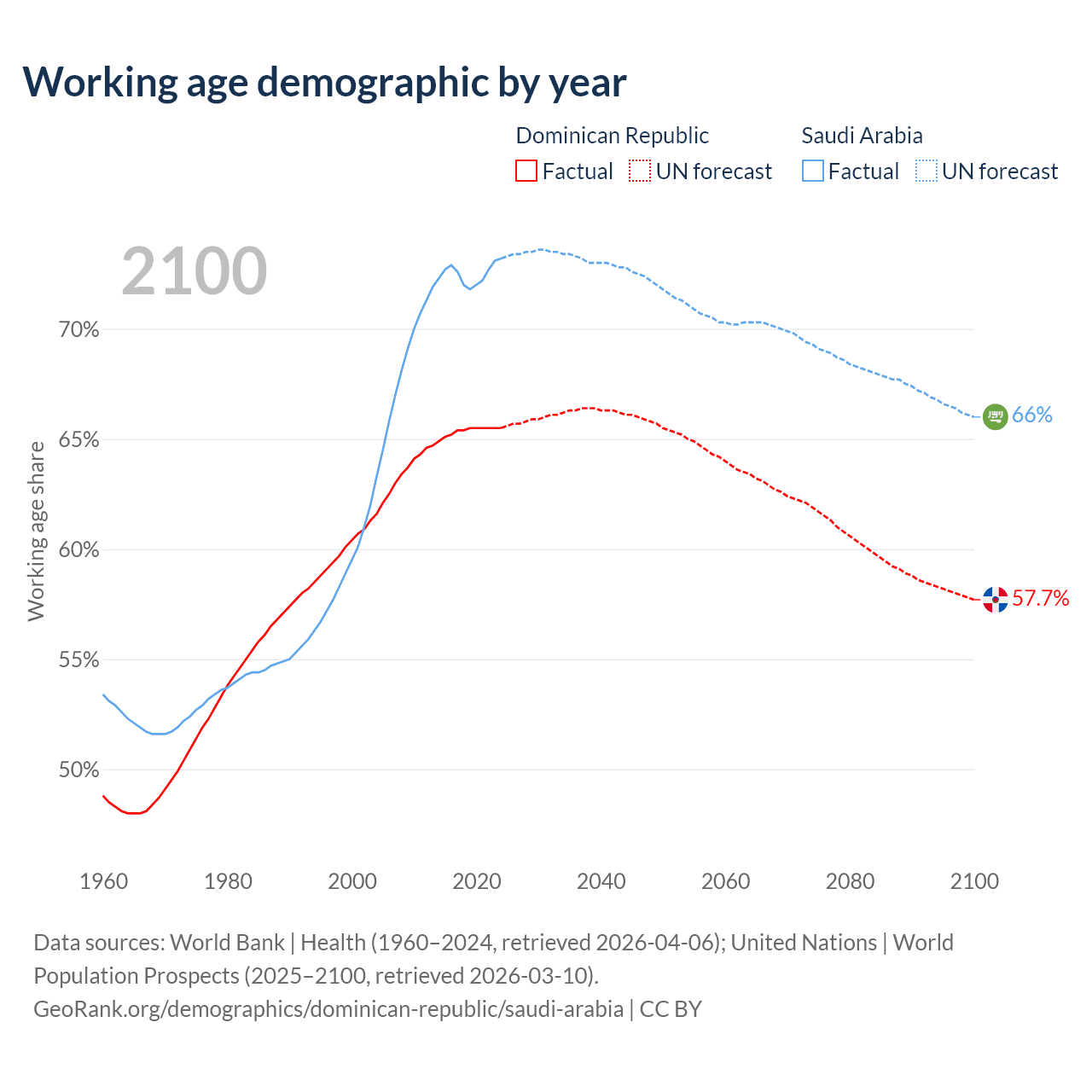Median age Dominican Republic vs Saudi Arabia, 1960-2100