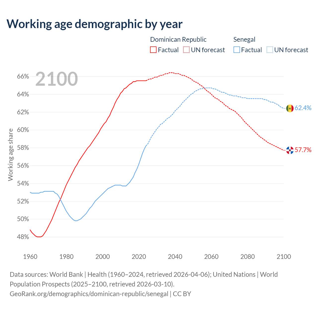Median age Dominican Republic vs Senegal, 1960-2100