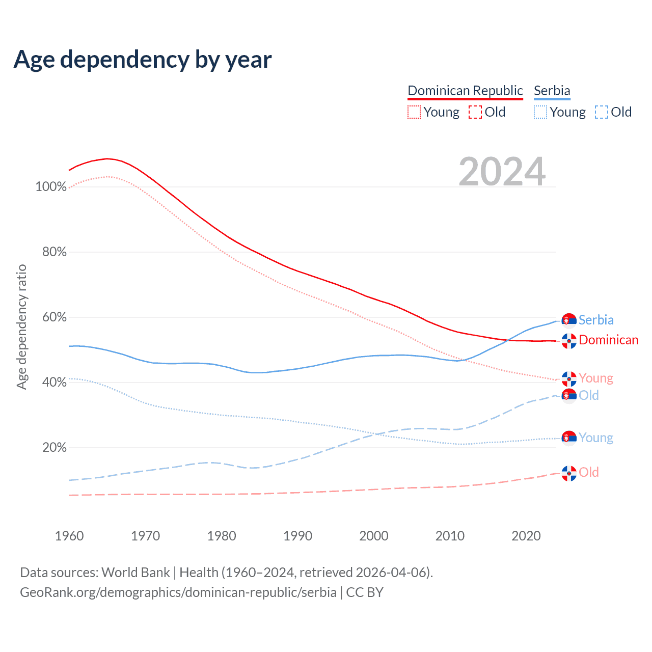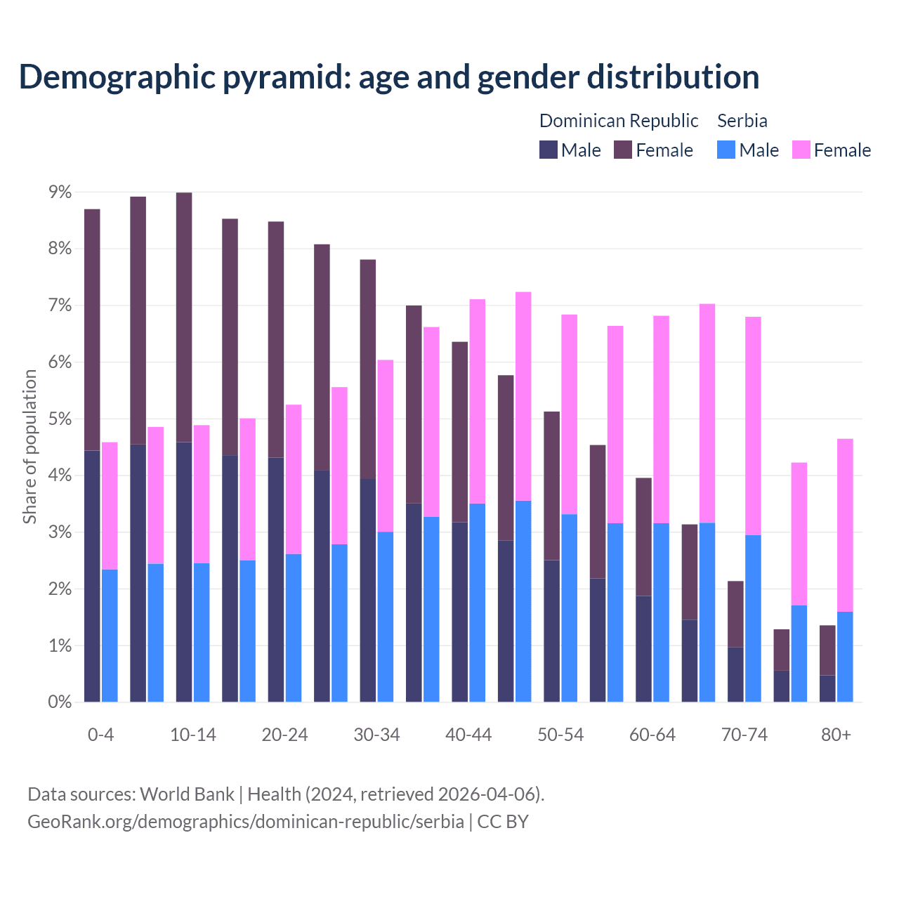 - The Dominican Republic is ranked 112/196 by median age (oldest to youngest) vs 15/196 for Serbia.