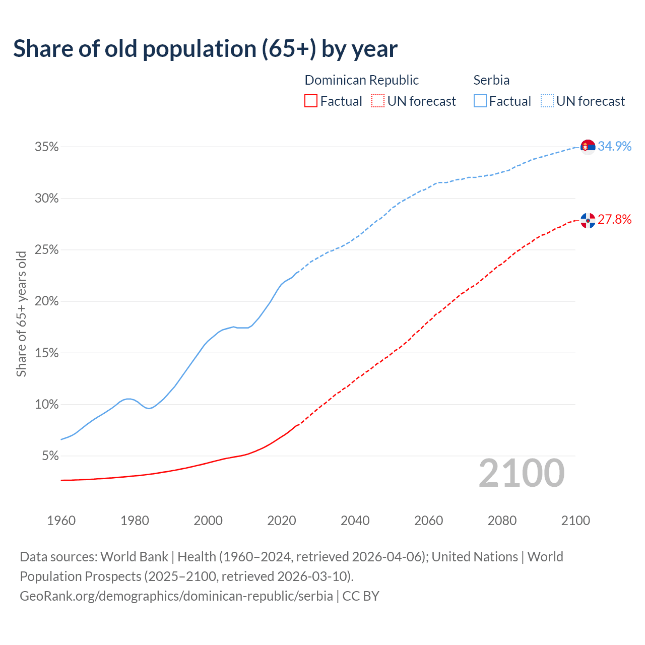 - The share of old-age demographic (65+) in the Dominican Republic is 7.88% vs 22.7% in Serbia.