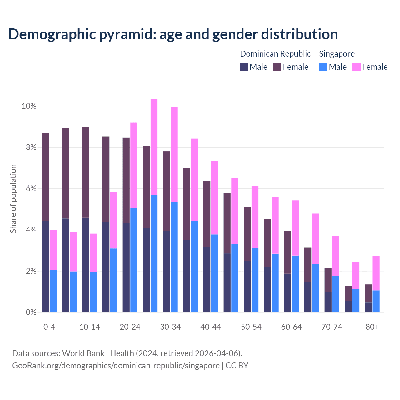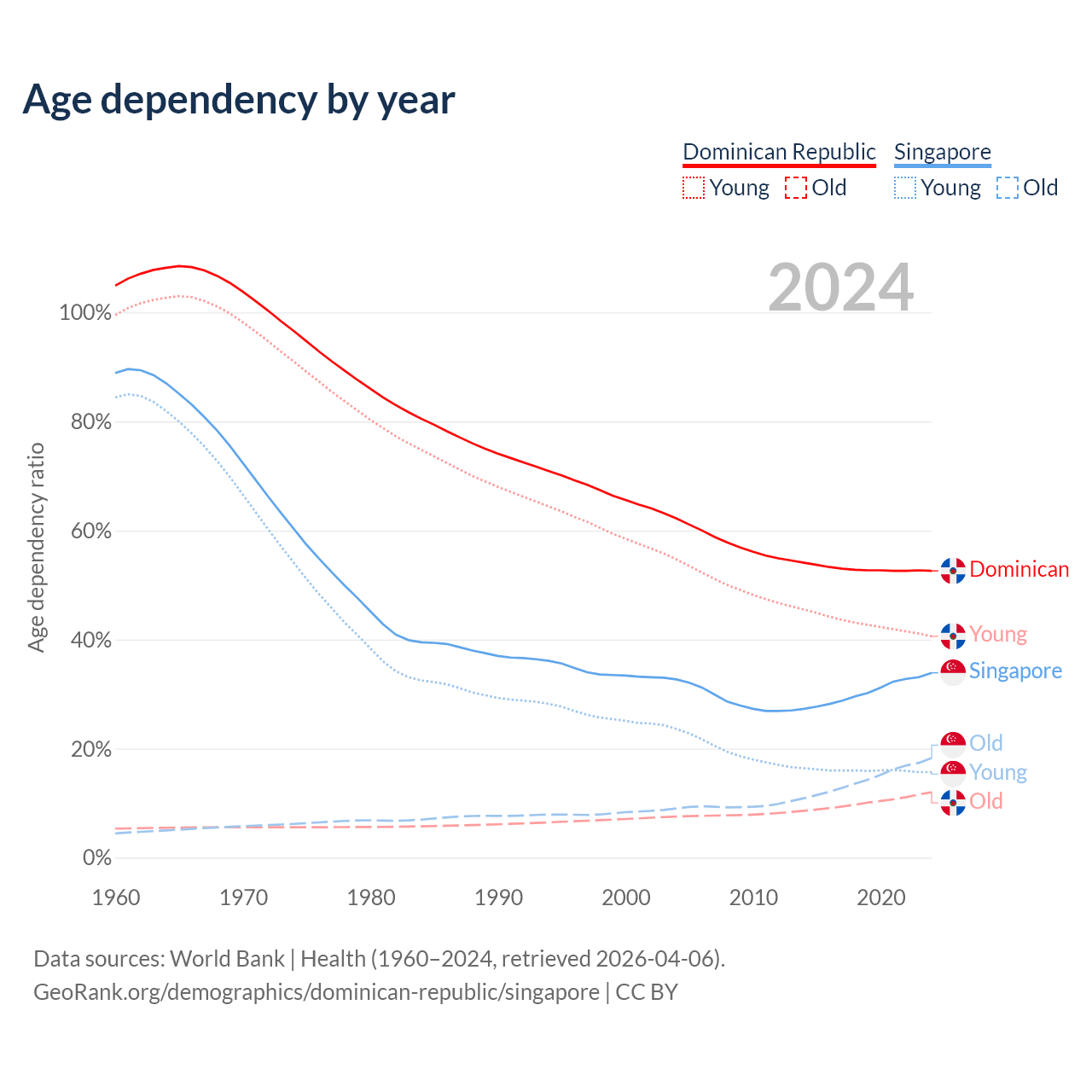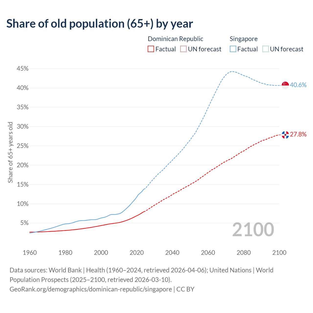 The share of older people aged 65 and over is 7.88% in the Dominican Republic and 13.7% in Singapore. Life expectancy in the Dominican Republic compared to Singapore .