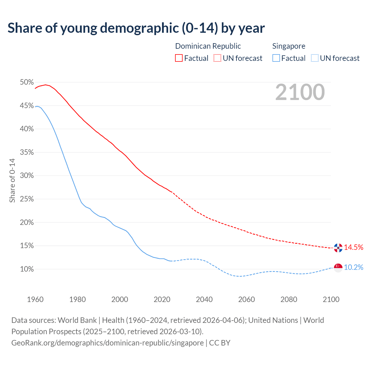 - The share of young demographic (0-15 years old) in the Dominican Republic is 26.6% vs 11.7% in Singapore.