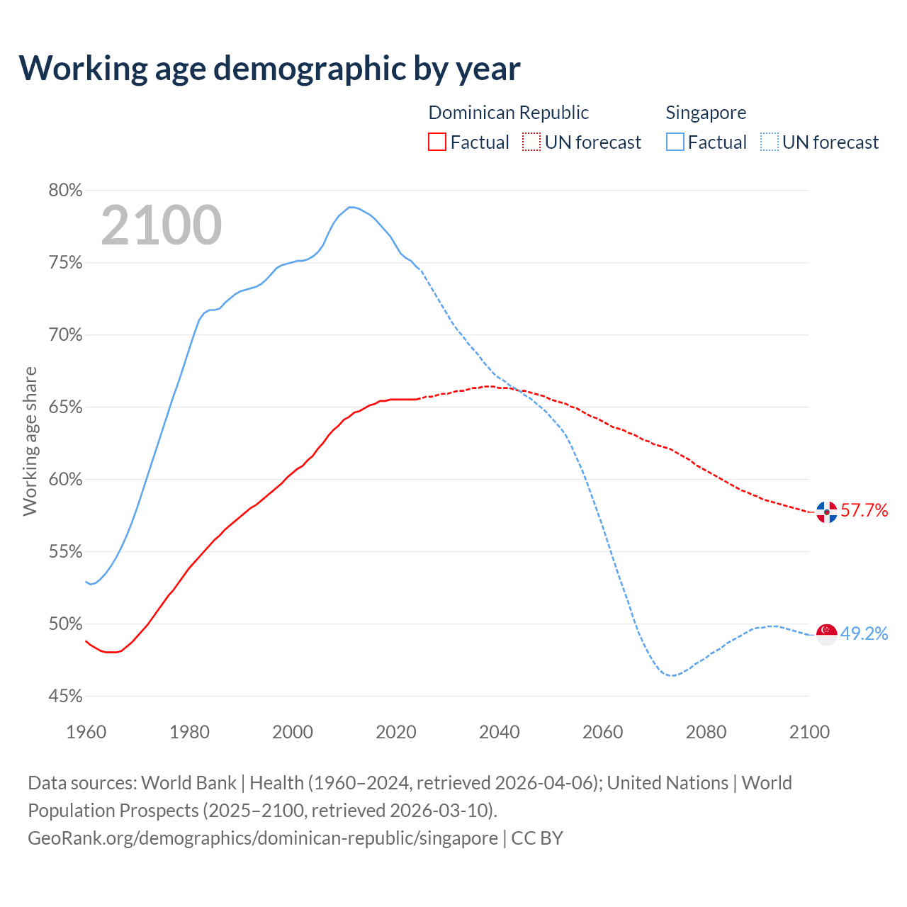Median age Dominican Republic vs Singapore, 1960-2100