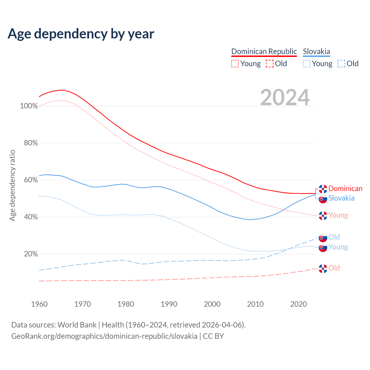- The Dominican Republic is ranked 112/196 by median age (oldest to youngest) vs 31/196 for Slovakia.