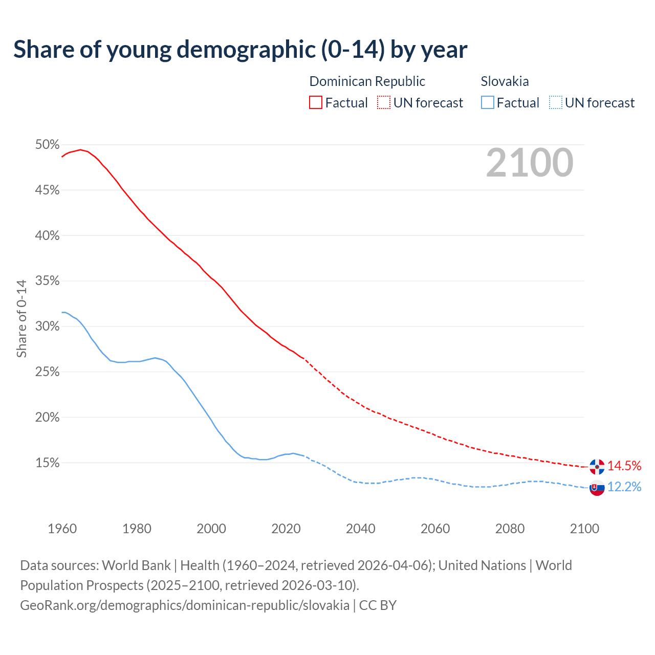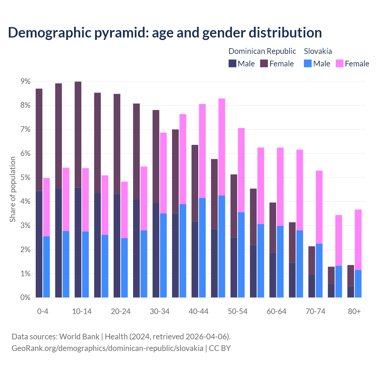 - The share of young demographic (0-15 years old) in the Dominican Republic is 26.6% vs 15.8% in Slovakia.