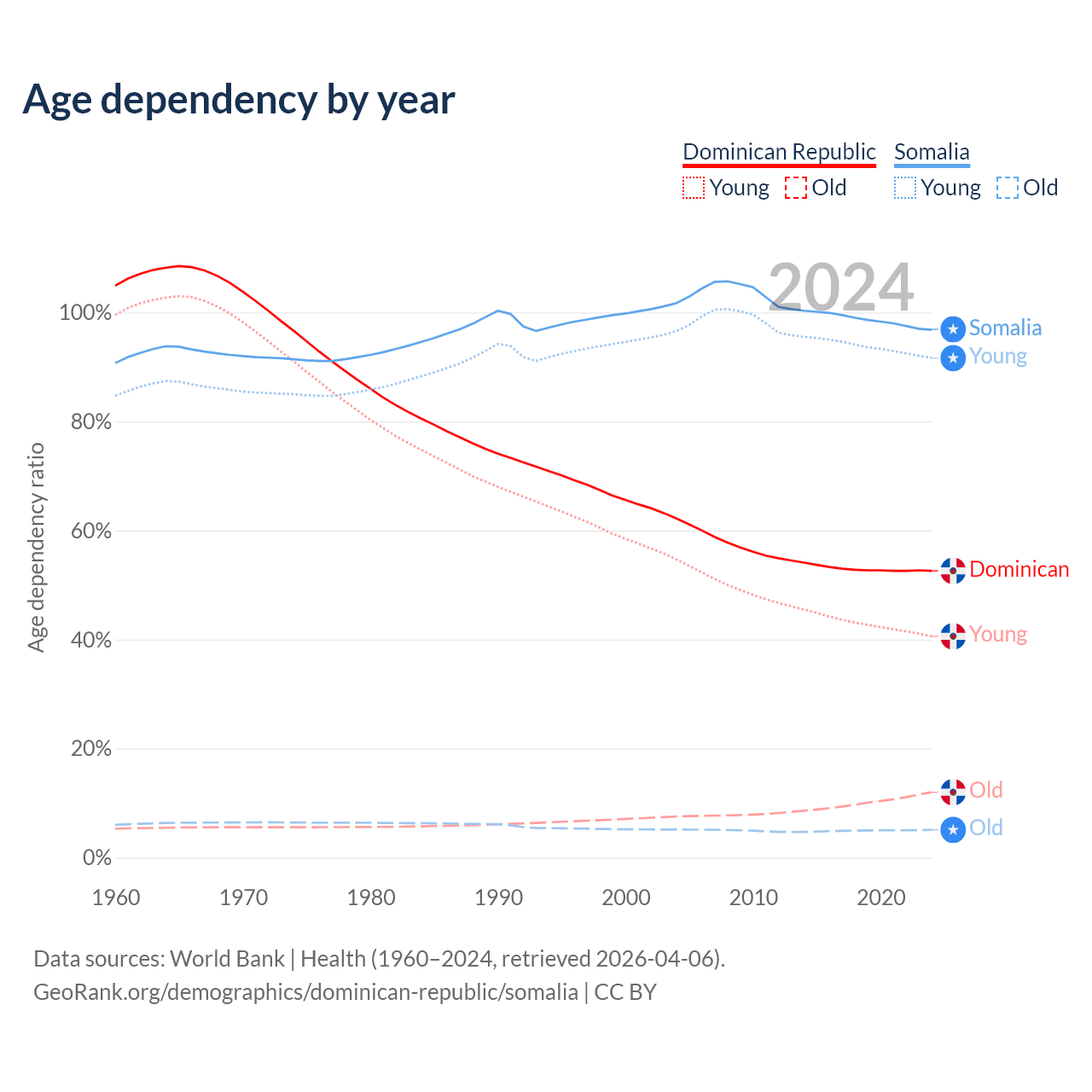 - The Dominican Republic is ranked 112/196 by median age (oldest to youngest) vs 194/196 for Somalia.