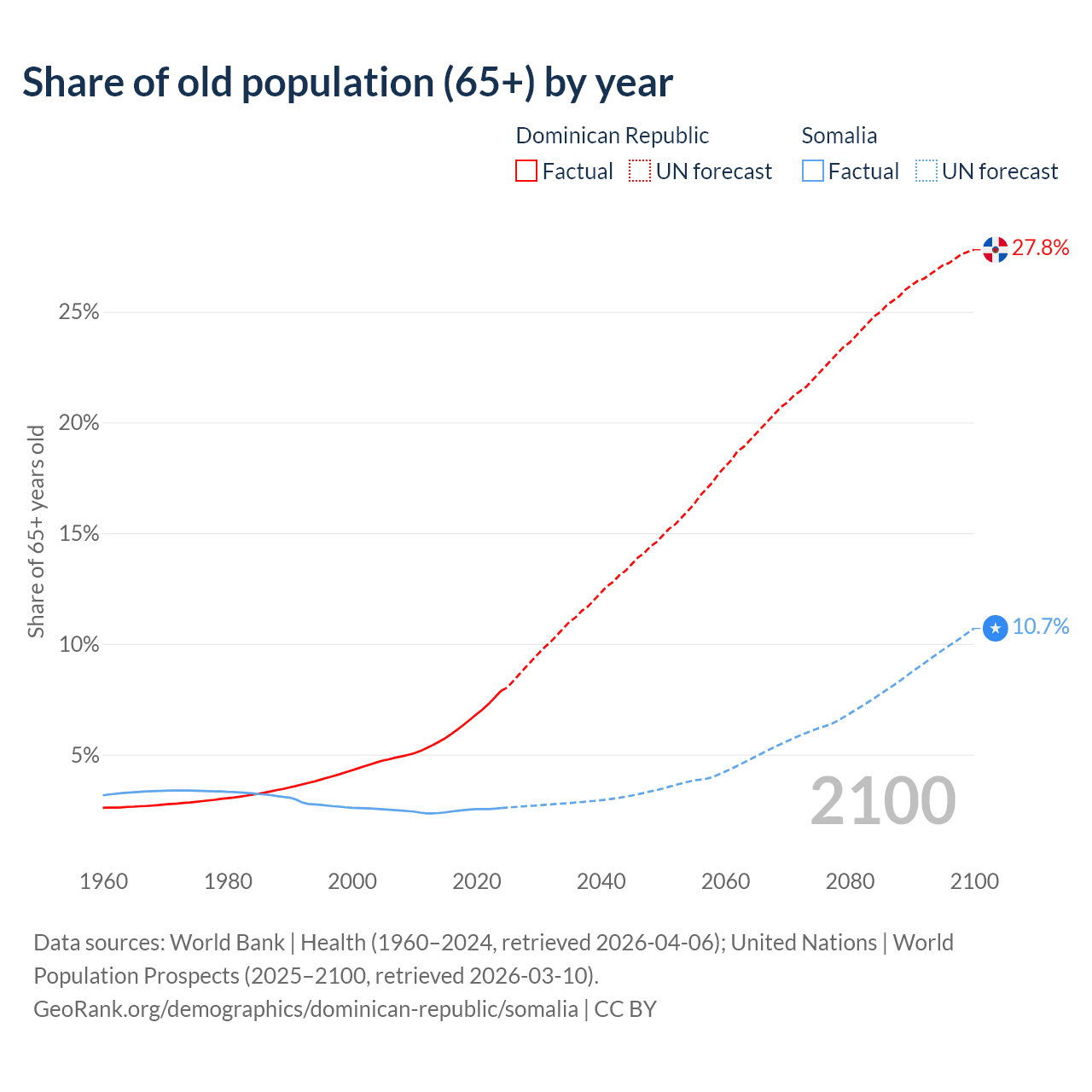 - The share of old-age demographic (65+) in the Dominican Republic is 7.88% vs 2.59% in Somalia.