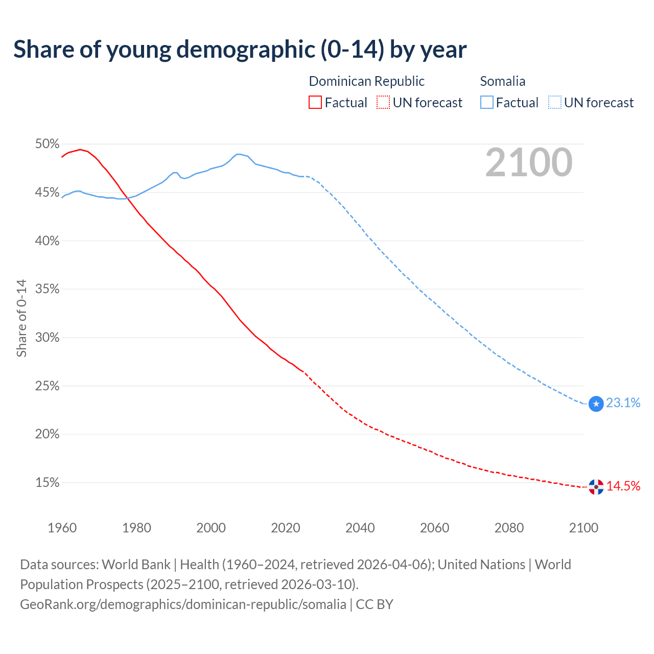 - The share of young demographic (0-15 years old) in the Dominican Republic is 26.6% vs 46.6% in Somalia.