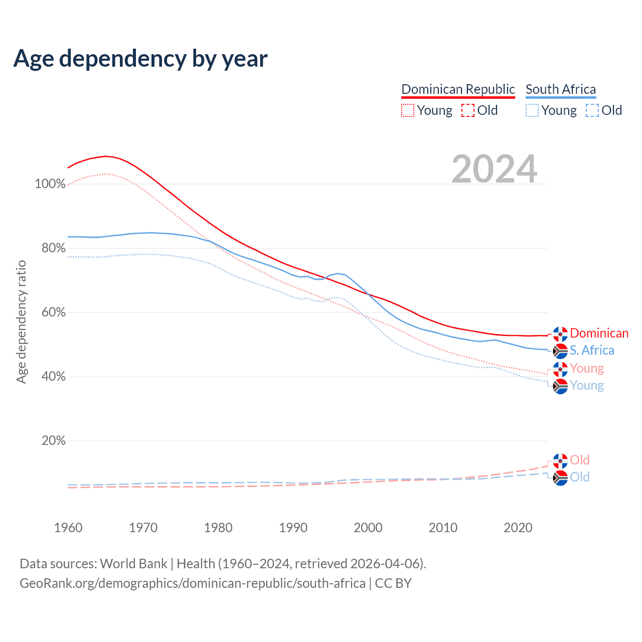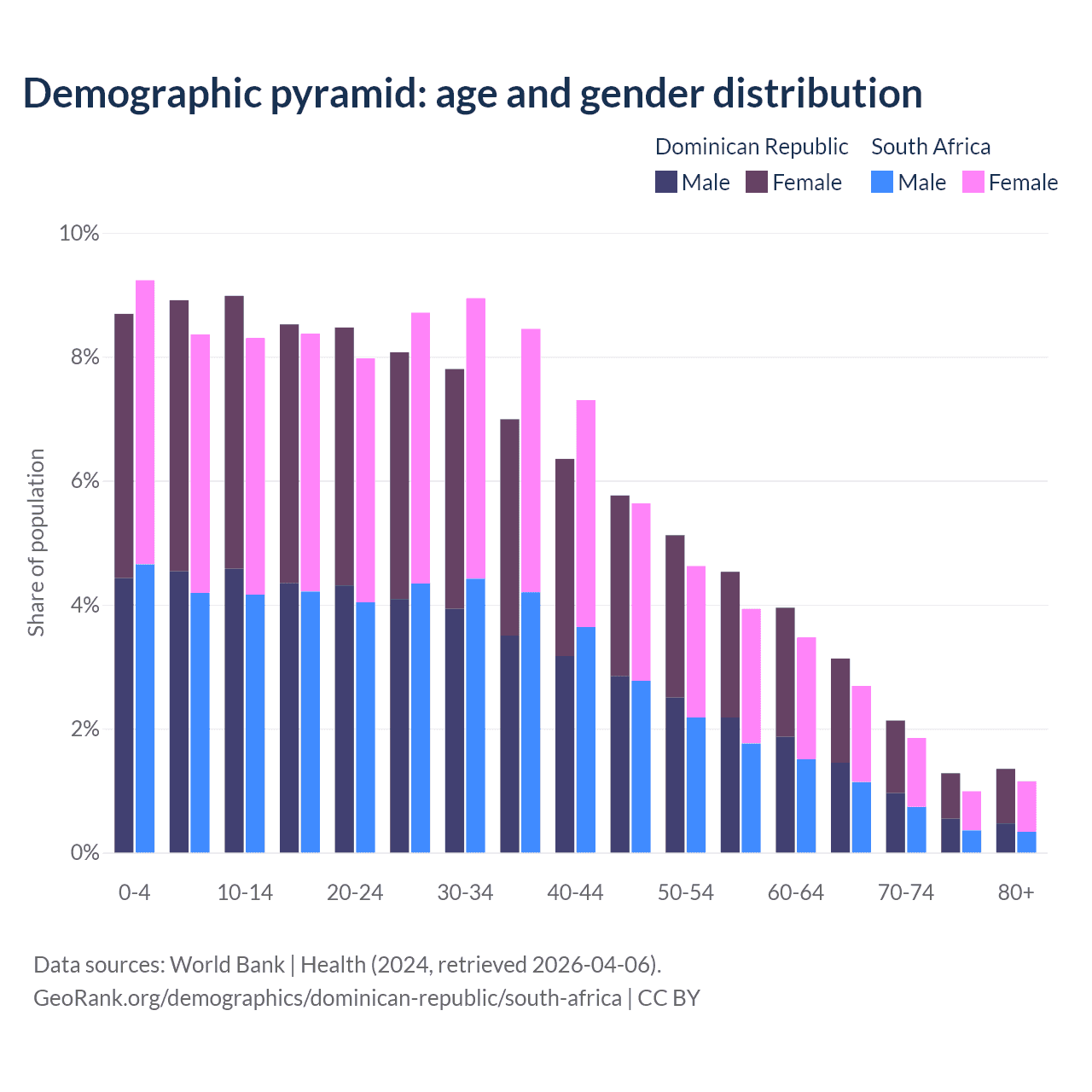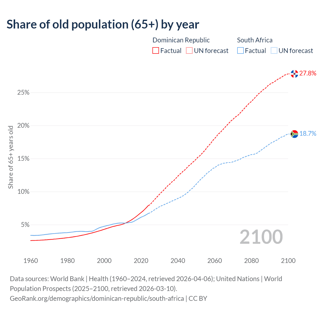 The share of older people aged 65 and over is 7.88% in the Dominican Republic and 6.69% in South Africa. Life expectancy in the Dominican Republic compared to South Africa .