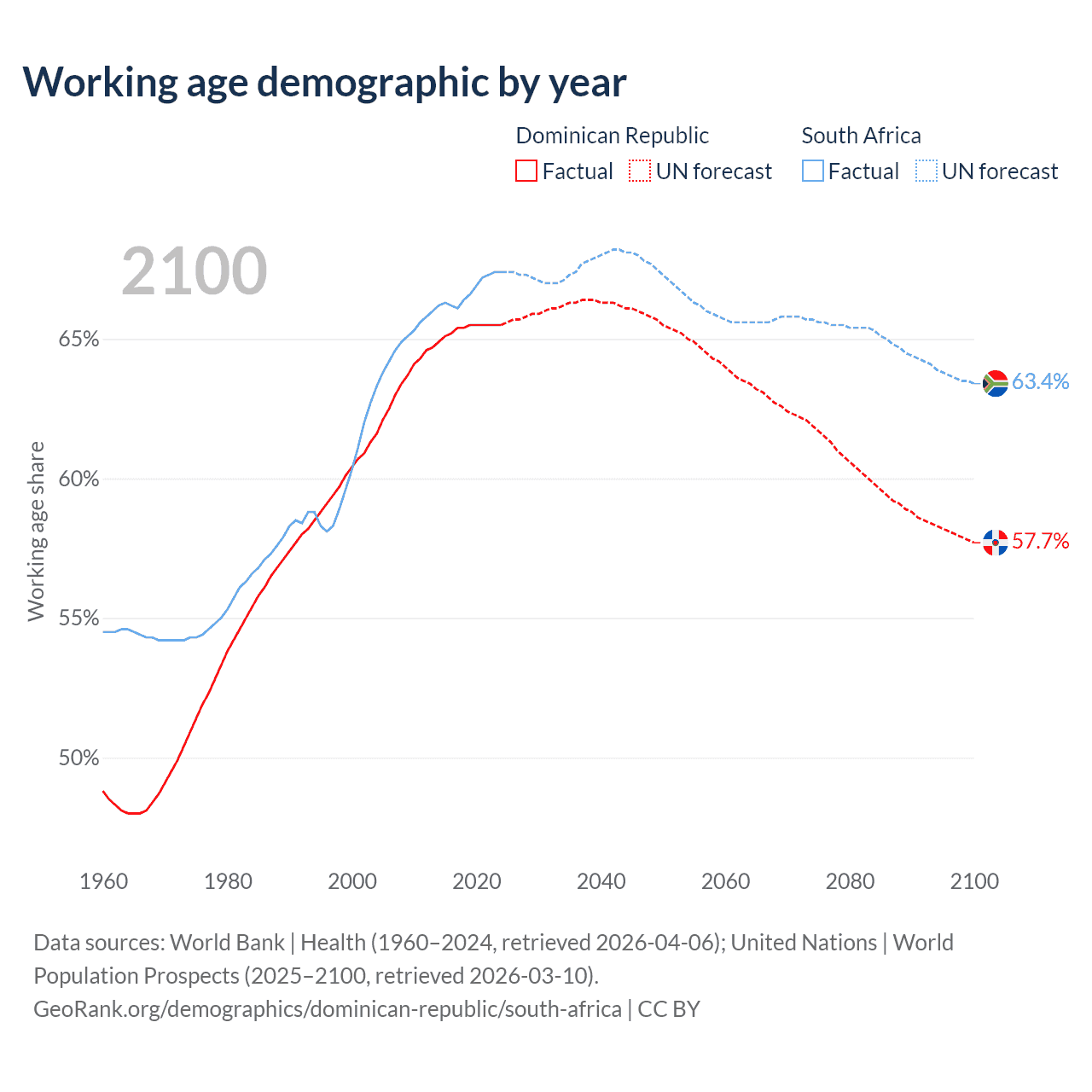 Median age Dominican Republic vs South Africa, 1960-2100