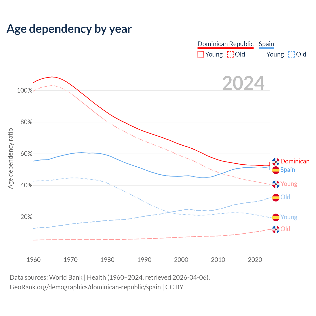 - The median age in the Dominican Republic is 29 years compared to 46.4 years in Spain.