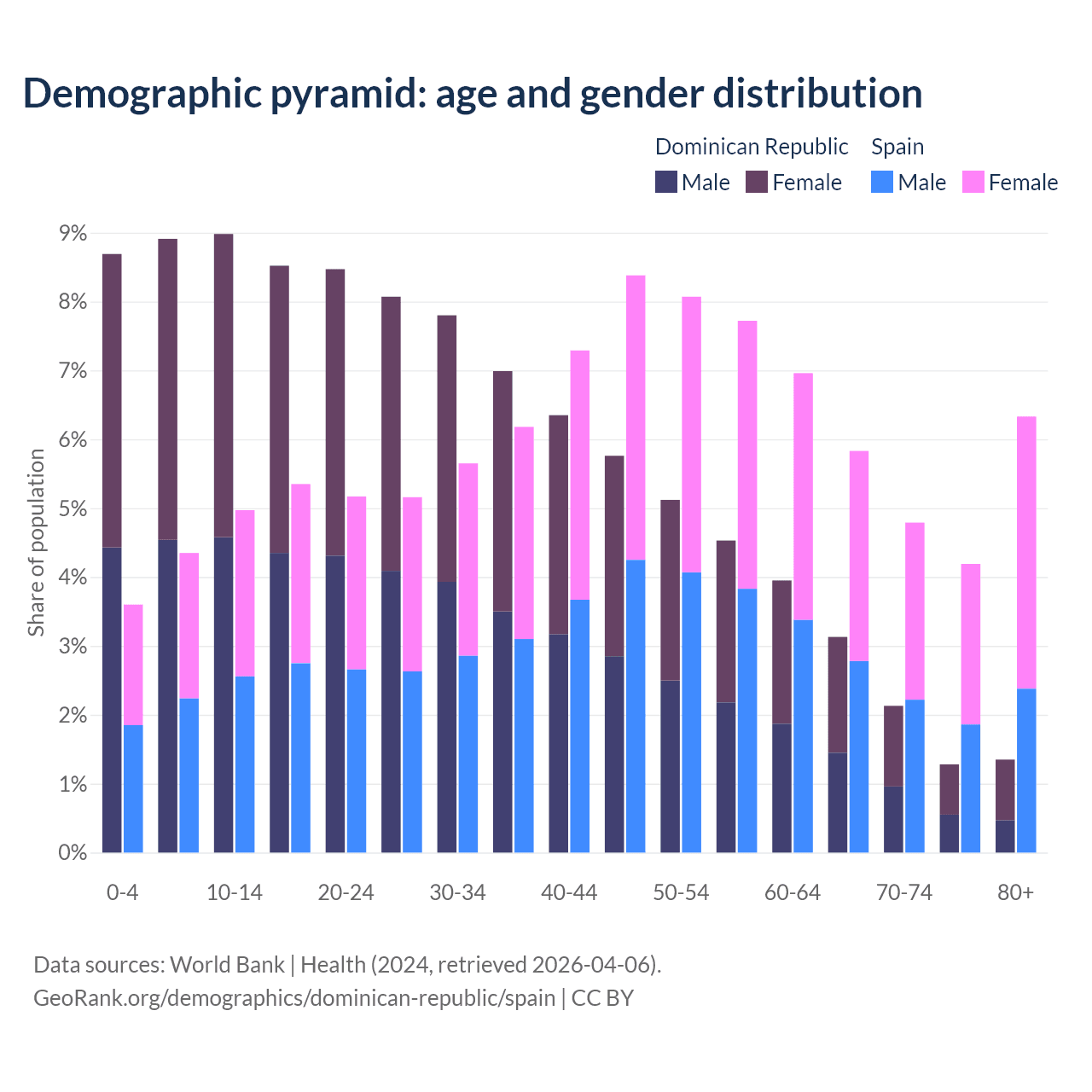 - The share of old-age demographic (65+) in the Dominican Republic is 7.88% vs 21.1% in Spain.