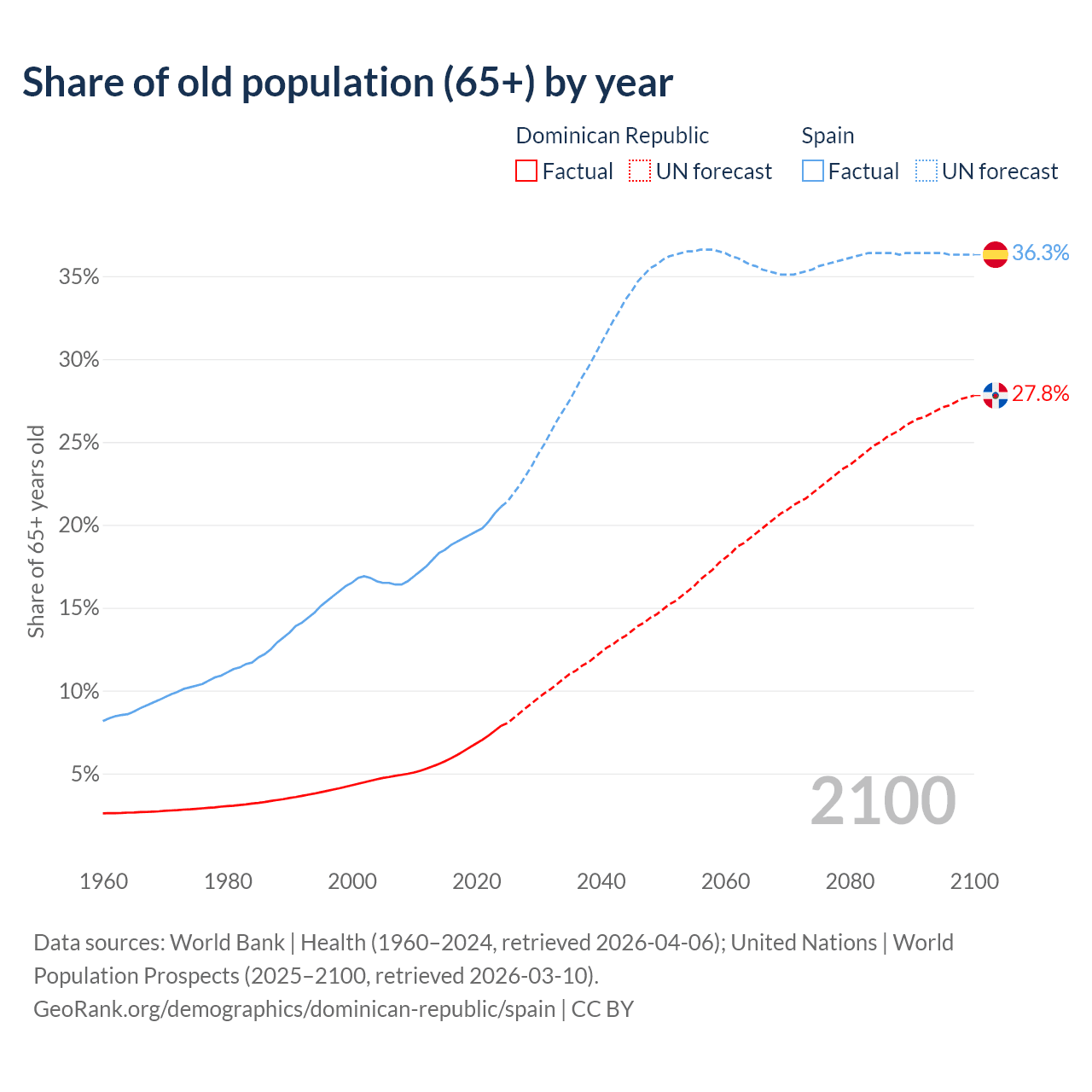 The share of older people aged 65 and over is 7.88% in the Dominican Republic and 21.1% in Spain. Life expectancy in the Dominican Republic compared to Spain .