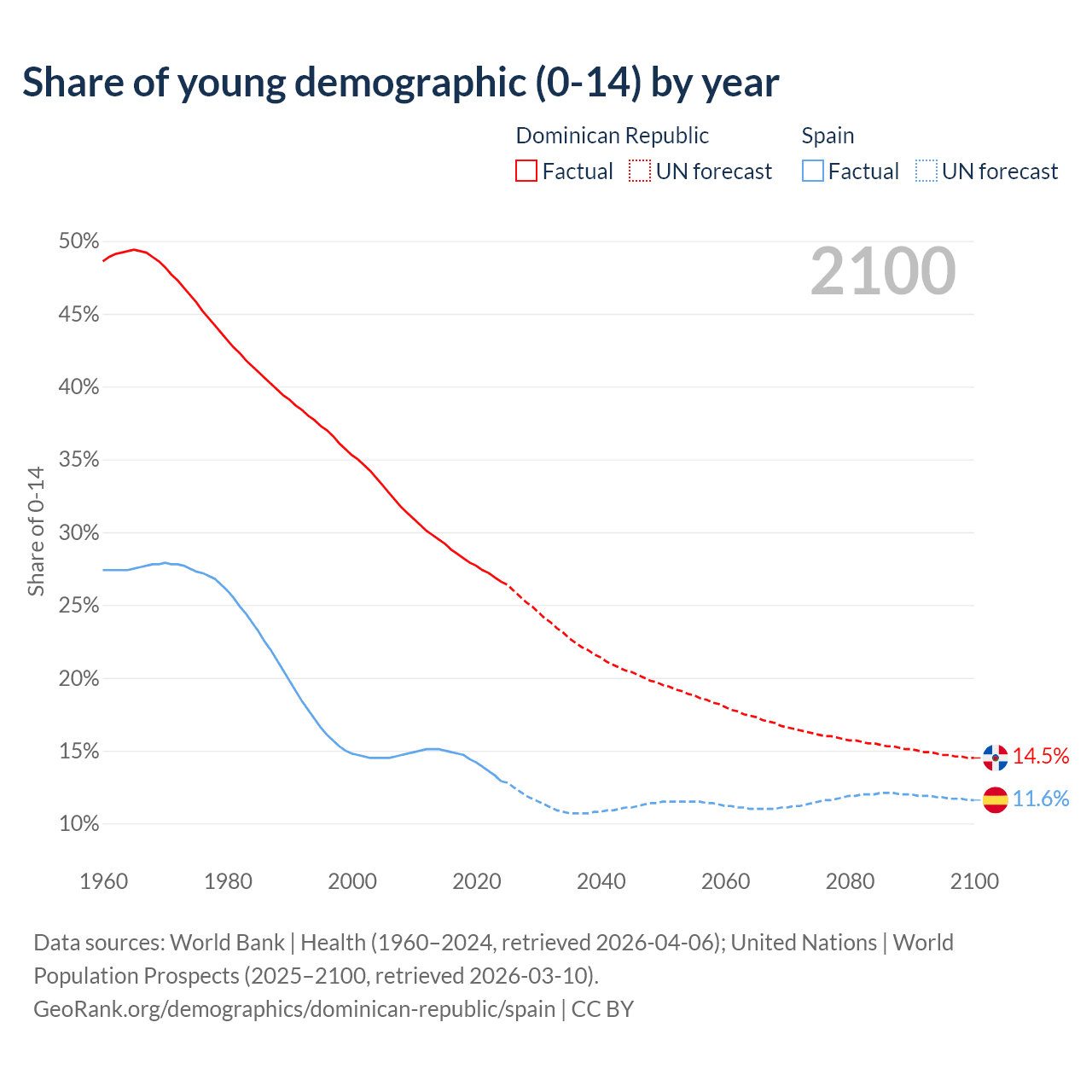 - The share of young demographic (0-15 years old) in the Dominican Republic is 26.6% vs 12.9% in Spain.
