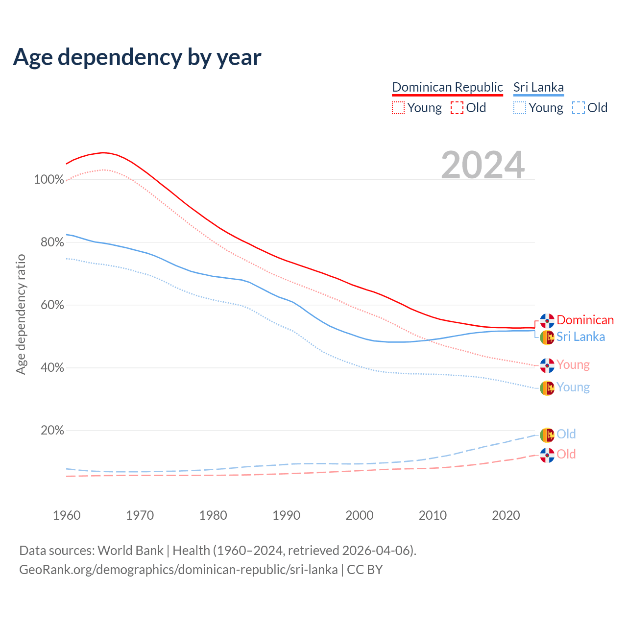 - The Dominican Republic is ranked 112/196 by median age (oldest to youngest) vs 81/196 for Sri Lanka.