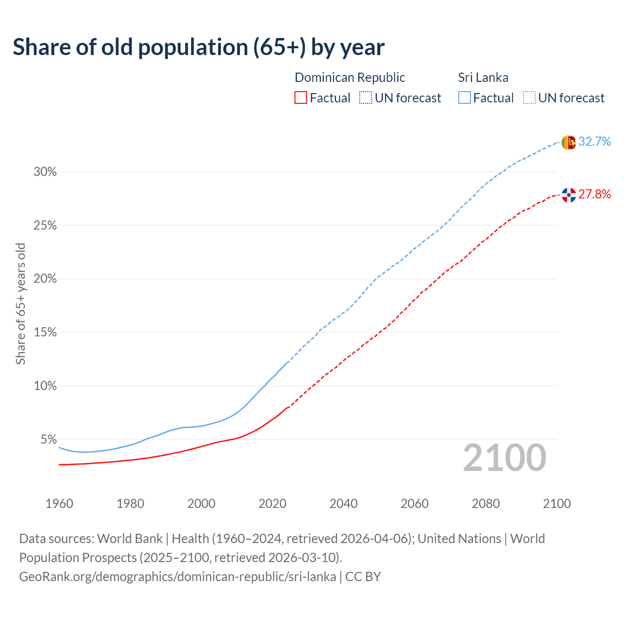 The share of older people aged 65 and over is 7.88% in the Dominican Republic and 12.1% in Sri Lanka. Life expectancy in the Dominican Republic compared to Sri Lanka .