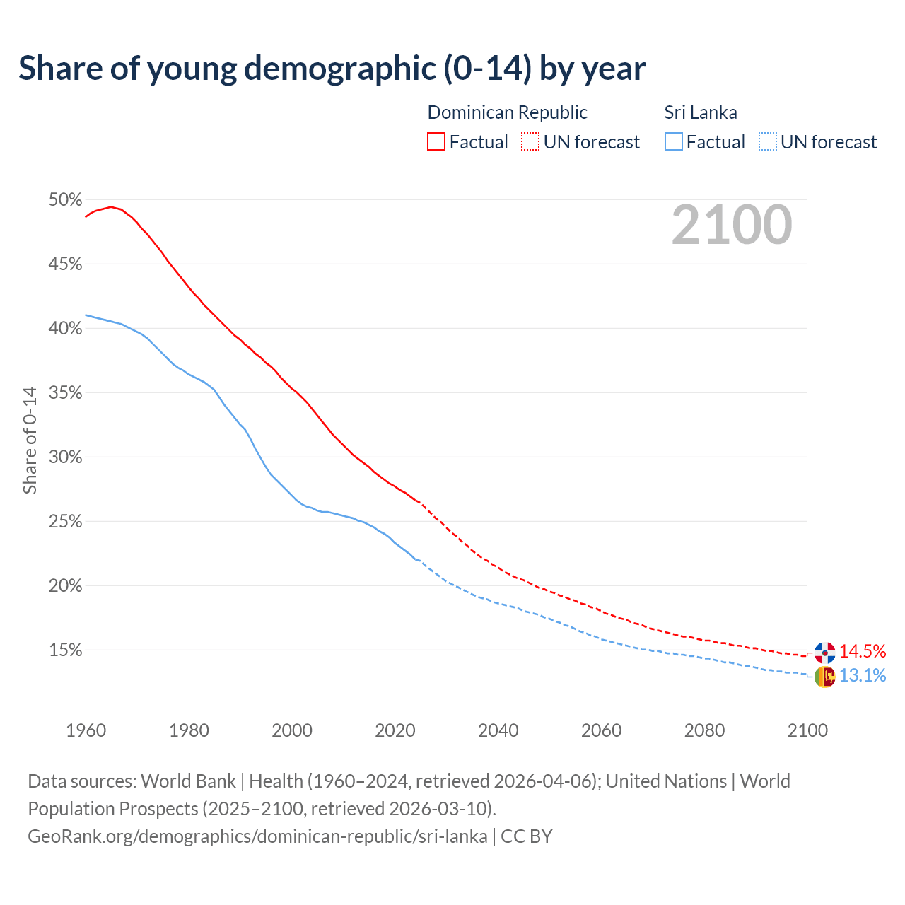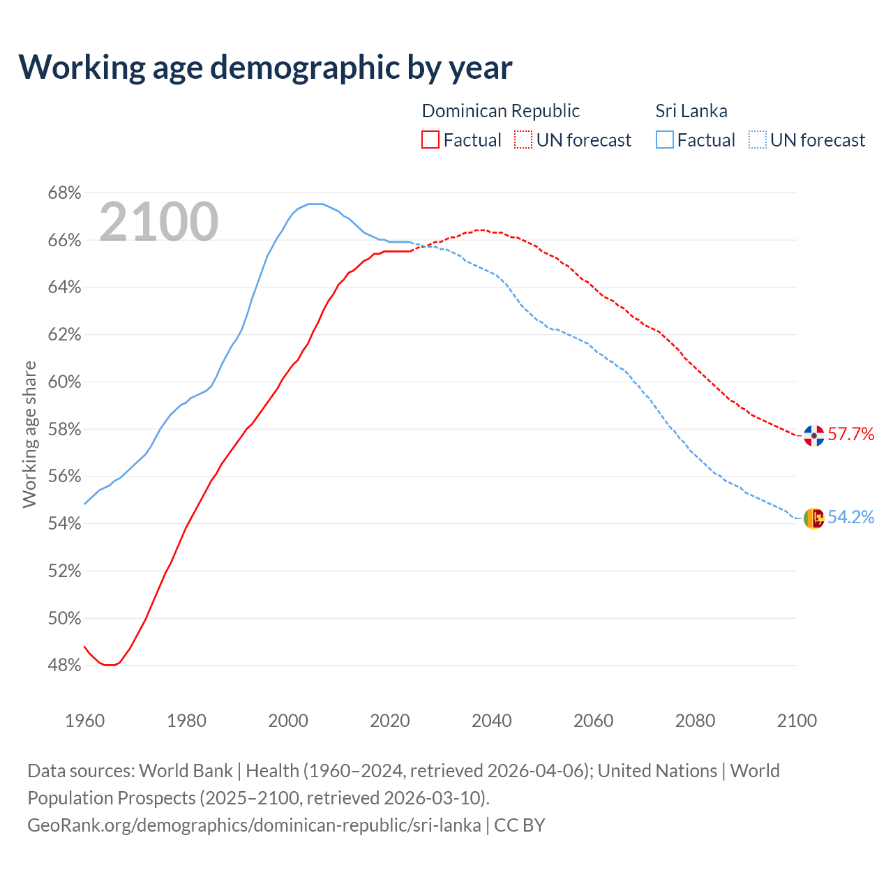 Median age Dominican Republic vs Sri Lanka, 1960-2100