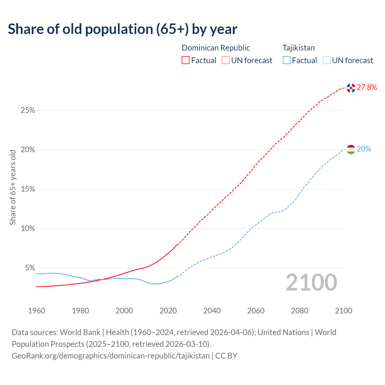 - The share of old-age demographic (65+) in the Dominican Republic is 7.88% vs 3.85% in Tajikistan.